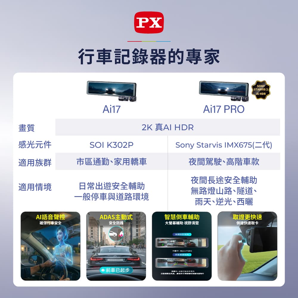 PX大通 Ai17 PRO 前後2K夜視HDR防眩電子後視鏡(SONY STARVIS 2 GPS WIFI)