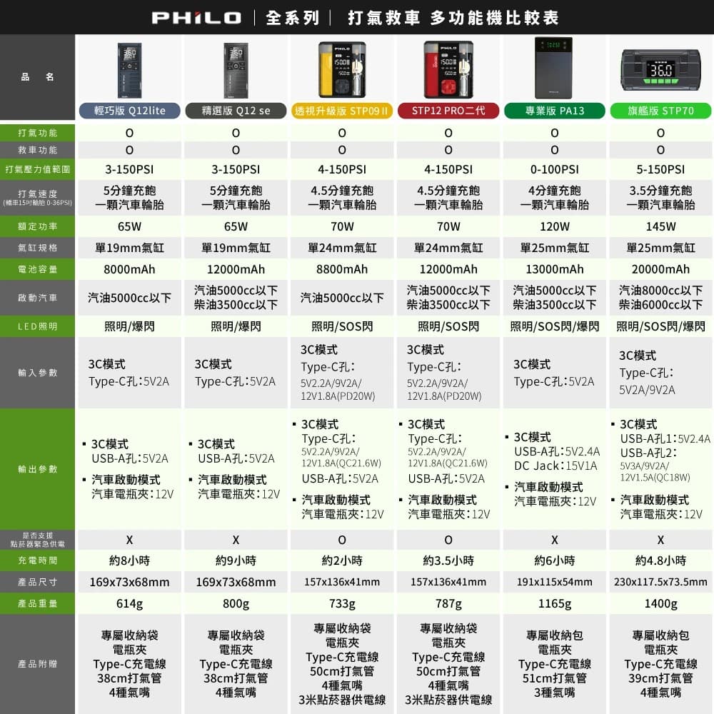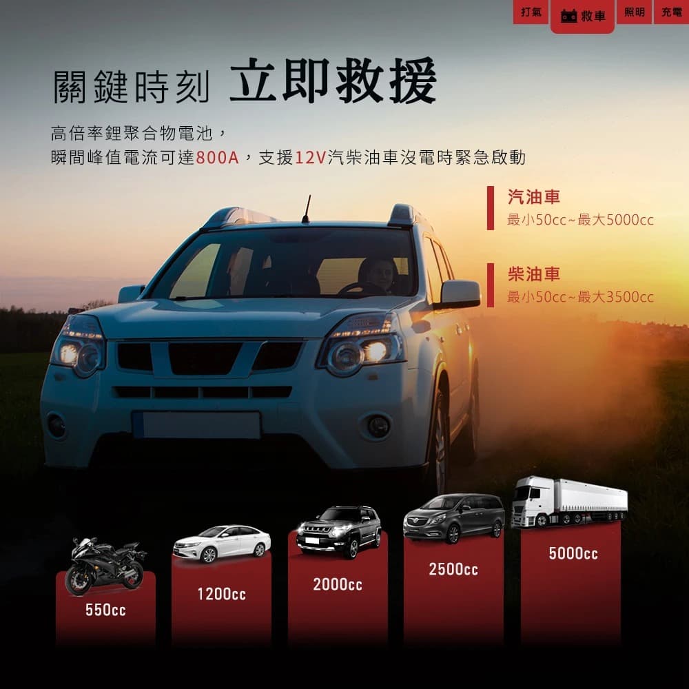 ◆ 5分鐘一條輪胎,皮卡、休旅都能直接落地打氣 ◆ 4 IN 1 救車x打氣x照明x充電,多種功能一機滿足 ◆ 12000mAh超大電容量,搭載4片電芯,超強啟動性能,12V汽柴油車救援2秒啟動 ◆ 高倍率鋰聚合物電池,瞬間峰值電流800A ◆ 支援5000cc以下汽油車、3500cc以下柴油車緊急啟動,重機、轎車、SUV、小貨車都能救援 ◆ 24mm超大缸體,一條15吋輪胎從0到36PSI只需5分鐘 ◆ 五種預設模式,汽車/機車/腳踏車/籃球,最高可設置150PSI ◆ 精準控壓,打飽後自動切斷輸出,不過度加壓好安心 ◆ 高精密感測晶片,接上輪胎自動測壓 ◆ 超大螢幕,當前氣壓值/目標氣壓值,雙數值顯示 ◆ 12000mAh鋰電池,無線打氣最方便 ◆ 附贈3米點菸頭供電線,沒電時可直接插點菸孔,透過汽車電瓶緊急為機器供電 ◆ 充氣口防燙設計,避免燙傷事件發生,使用更安全 ◆ 獨特環境燈設計,可直接放置於空間中點亮環境 ◆ 2種燈光切換,照明/SOS閃 ◆ 擁有Type-C / USB雙輸出孔,日常可當行動電源幫手機、平板充電 ◆ Type-C孔最高支援QC21.6W快充,Type-C孔亦是輸入孔,最高支援PD20W ◆ 機器沒電時只需充30-40分鐘,電量即可用於啟動汽車 ◆ 輕量體積,附贈專屬收納包,好拿好放好收納 ◆ 按扣式金屬接頭,無須擰螺絲快速打氣 ◆ 附贈多款氣嘴,適合各種充氣用品 ◆ 享原廠1年保固