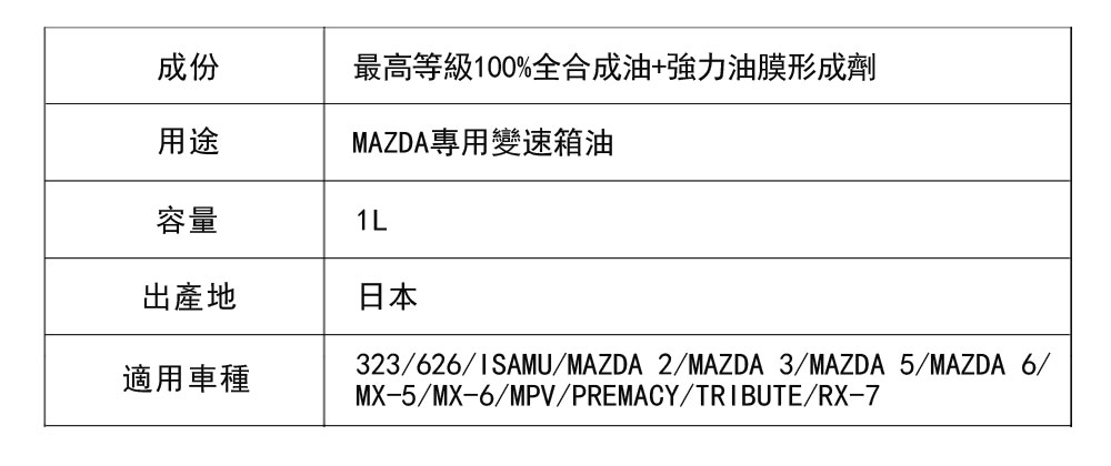 (1)專為MAZDA馬自達車款設計 (2)獨特配方耐熱性提升,有效幫助變速箱散熱 (3)強力油膜形成劑,換檔更順暢 (4)具橡膠諧和性,抑制橡膠老化 (5)添加劑抗磨損、抗起泡,延長壽命