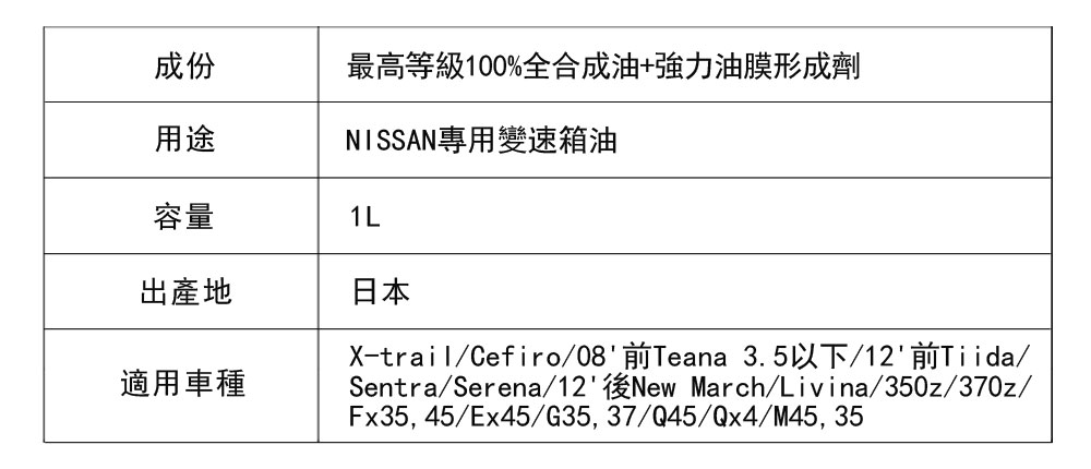 (1)專為NISSAN日產車款設計 (2)獨特配方耐熱性提升,有效幫助變速箱散熱 (3)強力油膜形成劑,換檔更順暢 (4)具橡膠諧和性,抑制橡膠老化 (5)添加劑抗磨損、抗起泡,延長壽命