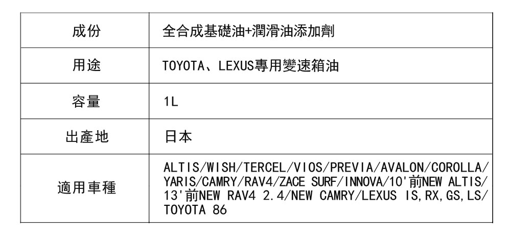 (1)專為TOYOTA豐田車款設計 (2)獨特配方耐熱性提升,有效幫助變速箱散熱 (3)強力油膜形成劑,換檔更順暢 (4)具橡膠諧和性,抑制橡膠老化 (5)添加劑抗磨損、抗起泡,延長壽命
