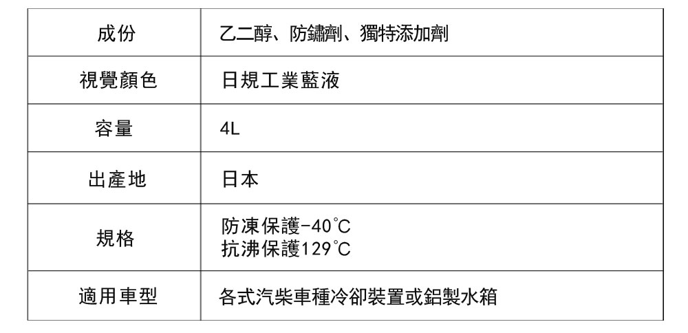 (1)ZERO/SPORTS 獨家研發配方,能有效且快速降低溫度。 (2)獨特配方能有效吸收引擎運轉時產生的高溫 (3)大幅降低引擎、機油及冷卻水溫度,使引擎運轉保持在巔峰狀態 (4)防凍保護可達攝氏-40℃,抗沸保護可達攝氏129℃ (5)超越日本工業JIS K 2234防腐蝕規範,對於鋁製水箱絕對是首選最佳推薦 (6)水箱精顏色採日規工業級用藍液,能清楚辨識冷卻系統管線滲漏