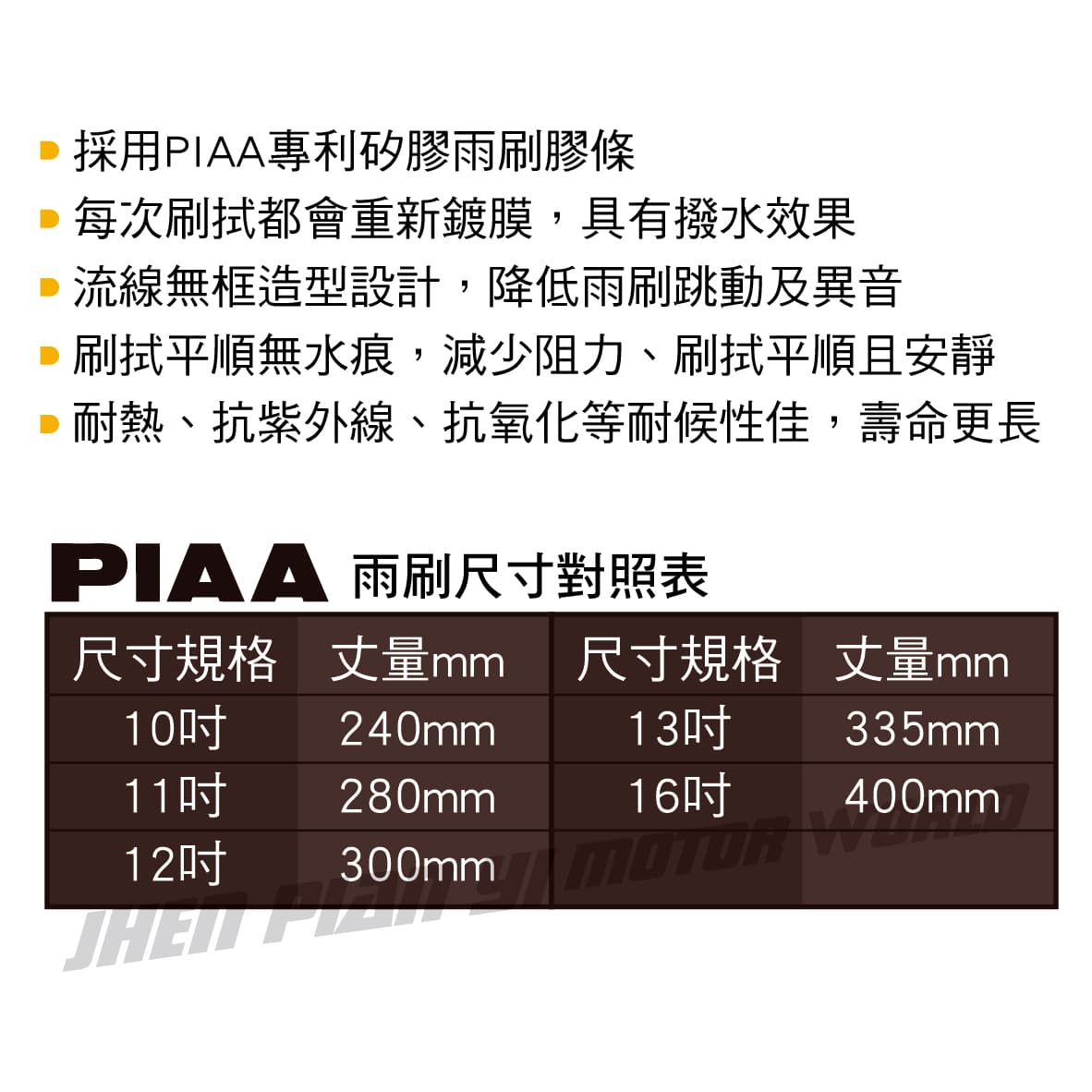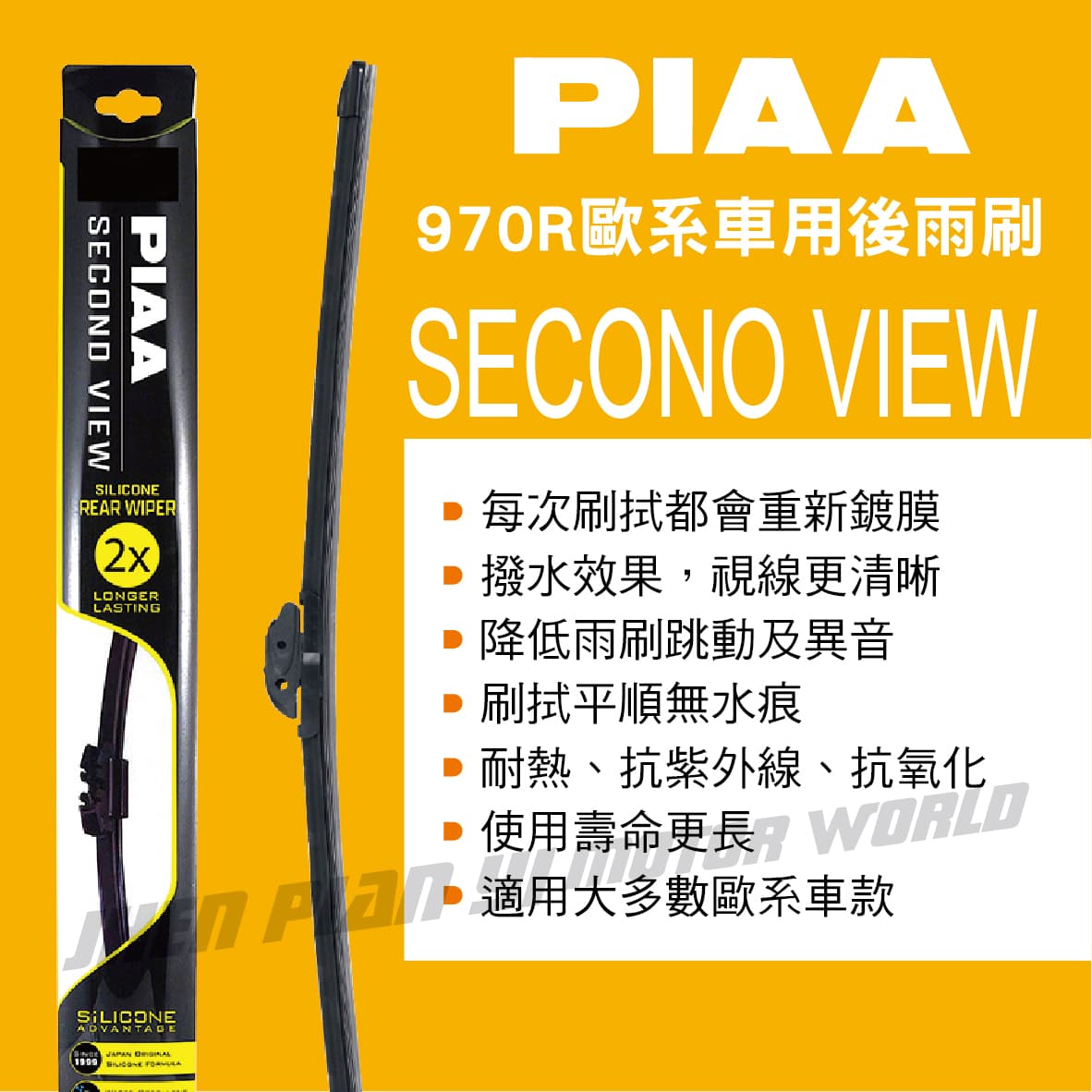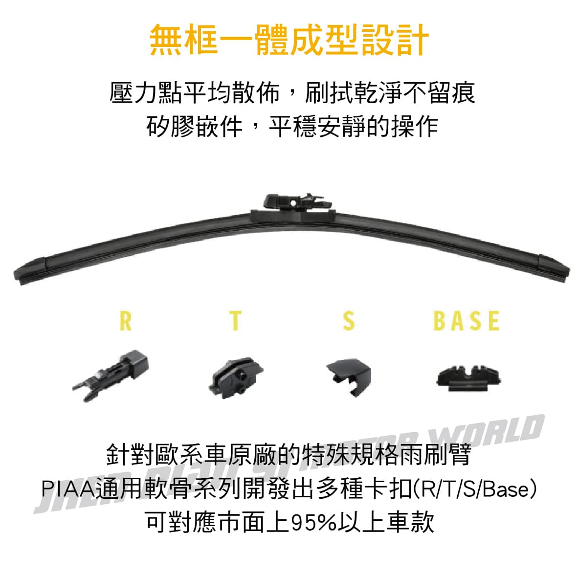 (1)採用PIAA專利矽膠雨刷膠條 (2)每次刷拭都會重新鍍膜,具有撥水效果 (3)在高速行駛中,雨水能快速滑落,讓視線更清晰 (4)無框一體成型設計,降低雨刷跳動及異音 (5)刷拭平順無水痕,減少阻力、刷拭平順且安靜 (6)耐熱、抗紫外線、抗氧化等耐候性佳,使用壽命更長 (7)內附多種接頭,適用95%歐系車款