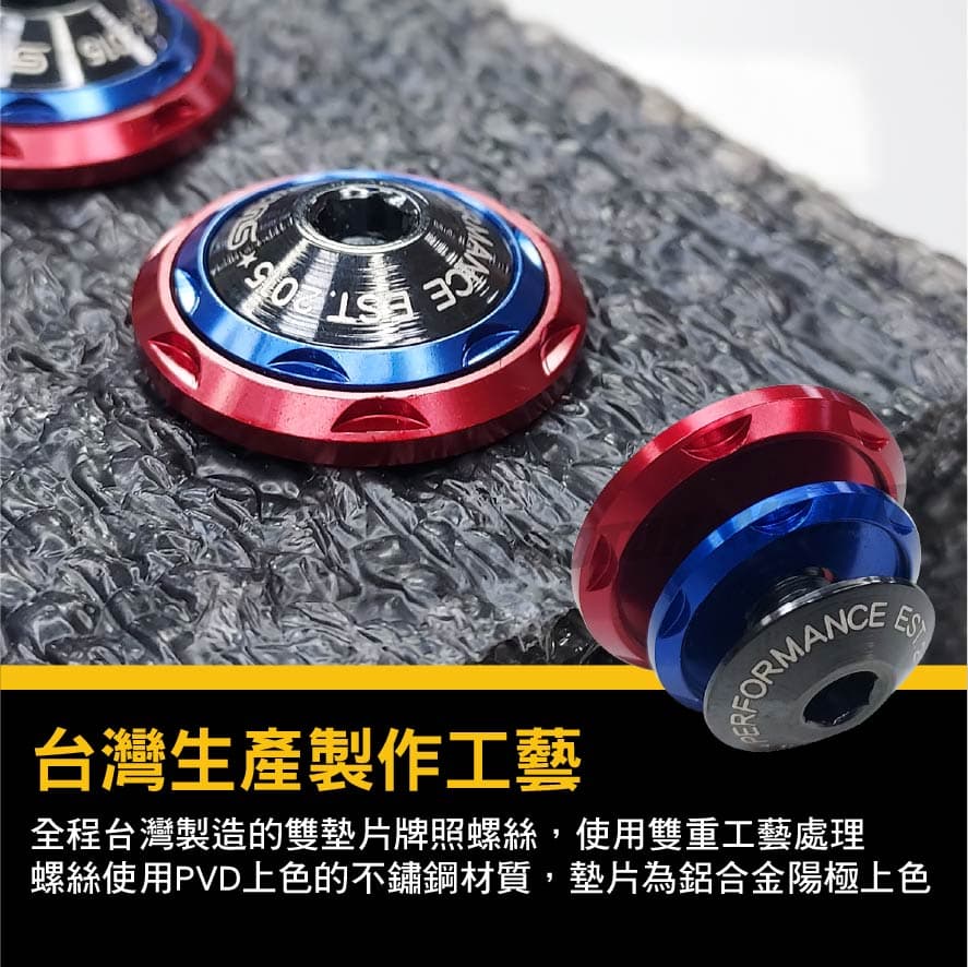 ‧全程台灣製造的雙墊片牌照螺絲 ‧使用雙重工藝處理 ‧螺絲使用PVD上色的不鏽鋼材質 ‧墊片為鋁合金陽極上色 ‧通用規格的墊片與螺絲可自由搭配使用