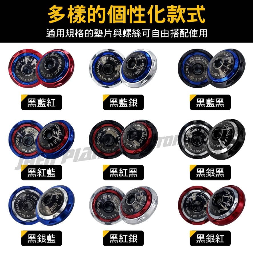 (1)採用不鏽鋼、鋁合金材質,外層使用獨特PVD鍍層 (2)有別於一般螺絲墊片陽極上色,全以PVD電鍍拋光處理 (3)不易生鏽且具有高抗UV的特性,呈現高級質感 (4)堅固、耐用且常保美觀,多種顏色任君挑選 (5)簡單且明瞭地安裝,輕輕鬆鬆不費任何功夫 (6)汽車、機車、重機解皆適用簡易安..