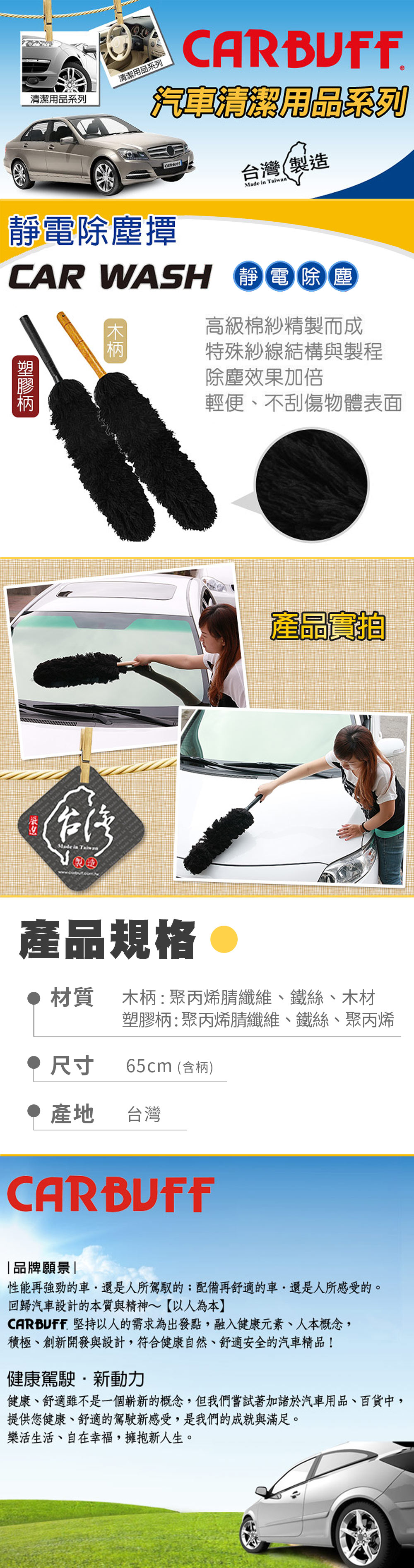 (1)台灣製造,可伸縮設計/輕便/清潔效果佳 (2)採用高級壓克力紗配合台灣精緻加工技術精製而成 (3)手柄採用可伸縮鋁合金設計,可任意伸縮變換所需長度 (4)適用汽車內外清潔、居家空間清潔,輕鬆清除物體表面灰塵 (5)質地細緻,不刮傷物體表面,汽車、傢俱皆可使用,是您生活中的好幫手..