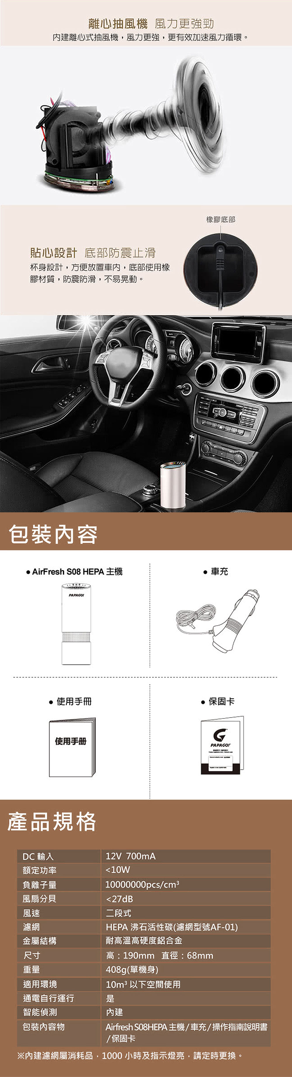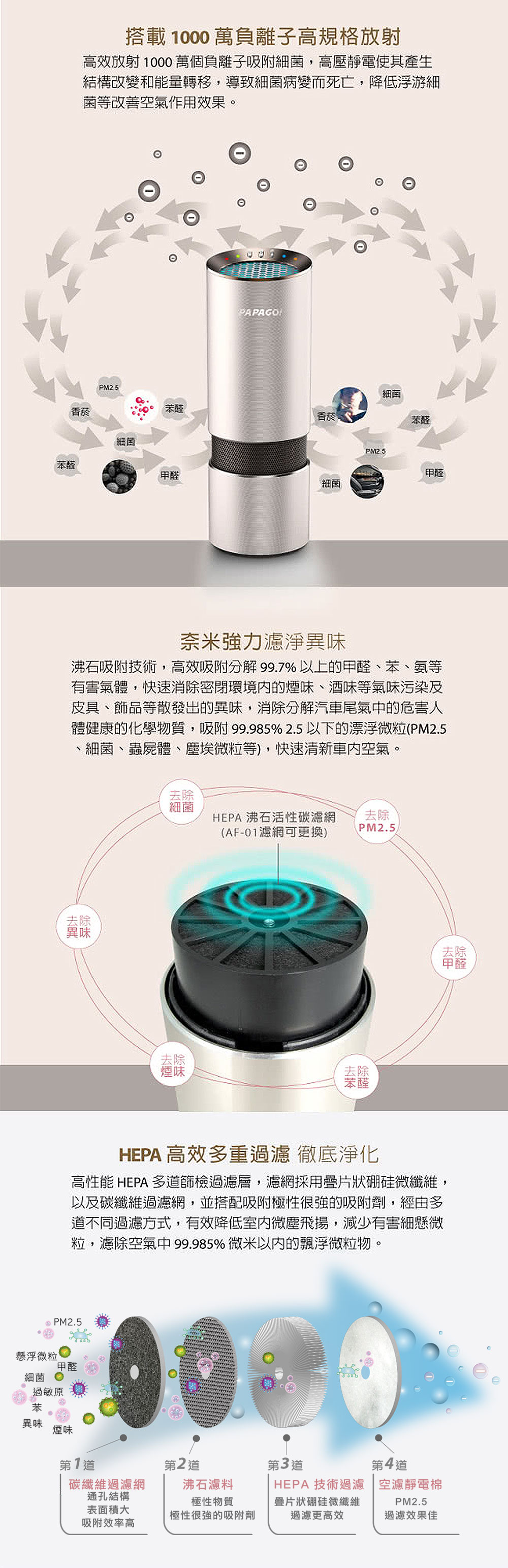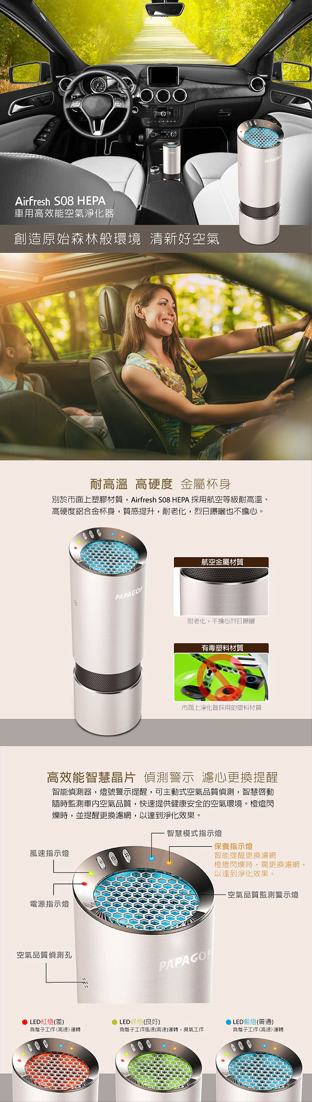 [預購]PAPAGO! Airfresh S08 HEPA高效過濾PM2.5 車用空氣清淨機
