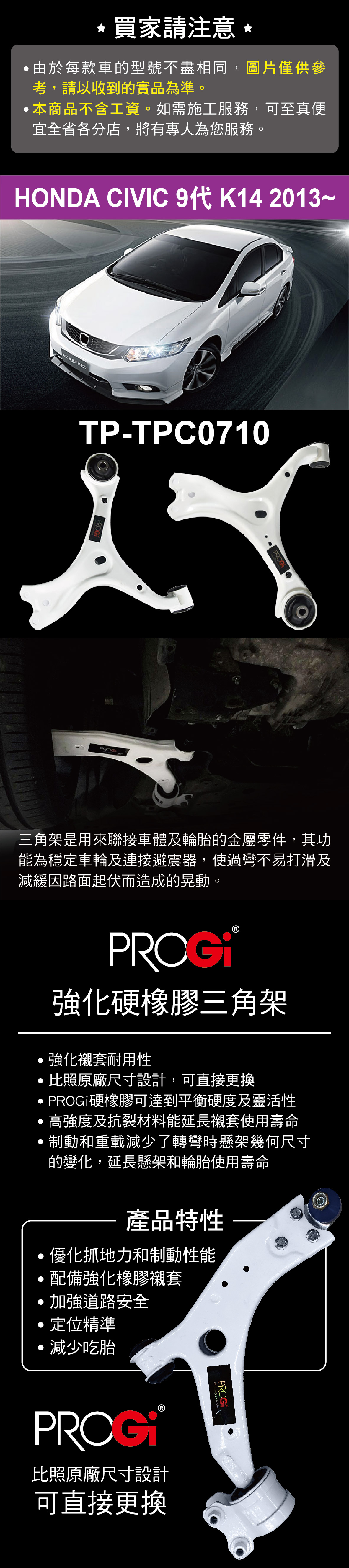 PROGi TP-TPC0710 強化硬橡膠三角架(HONDA CIVIC 9代 K14 2013~)(無保固/工資另計/售完為止)
