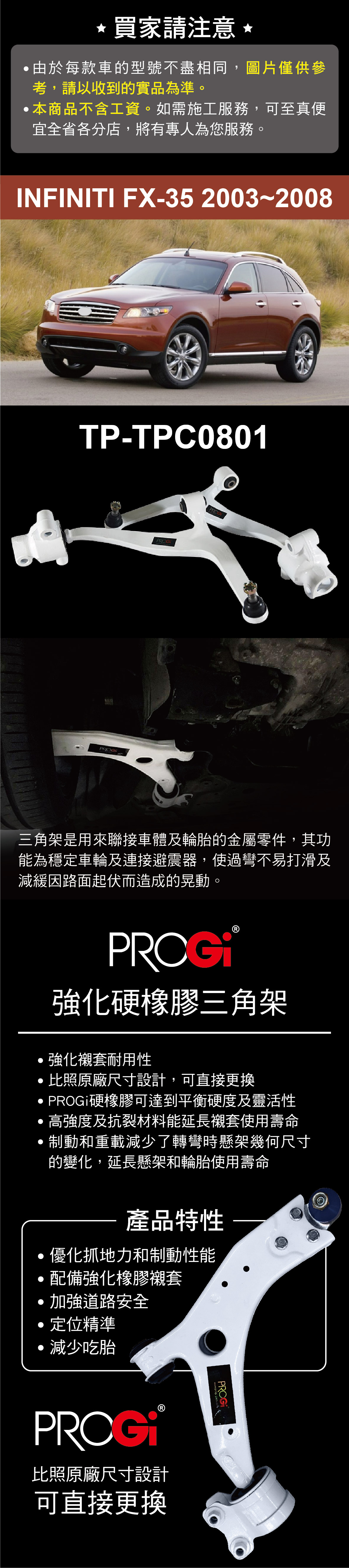 PROGi TP-TPC0801 強化硬橡膠三角架(INFINITI FX-35 2003~2008)(無保固/工資另計/售完為止)