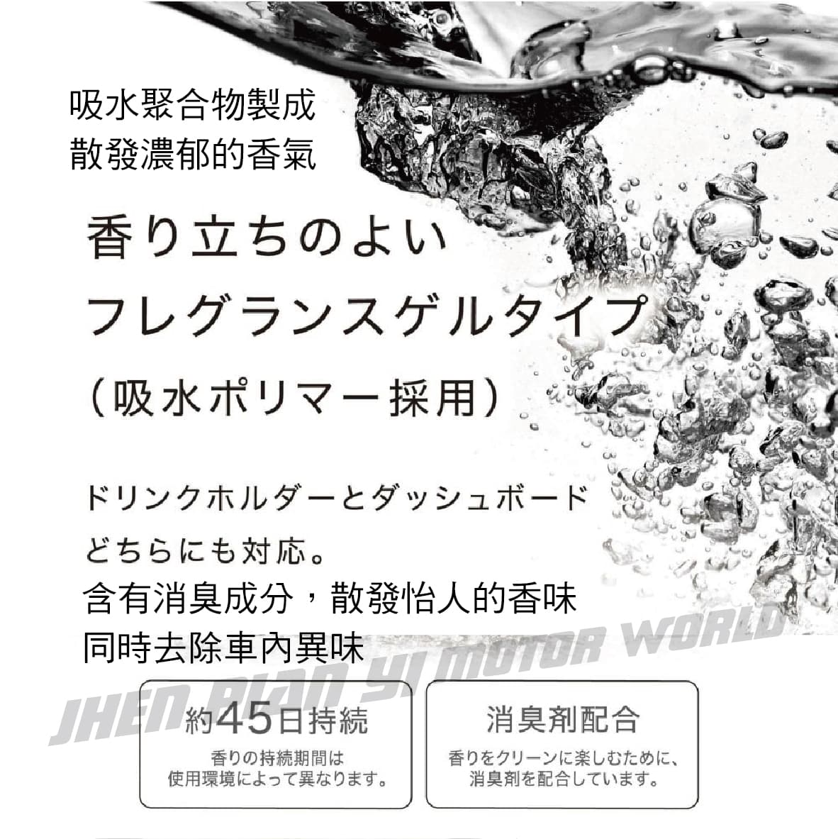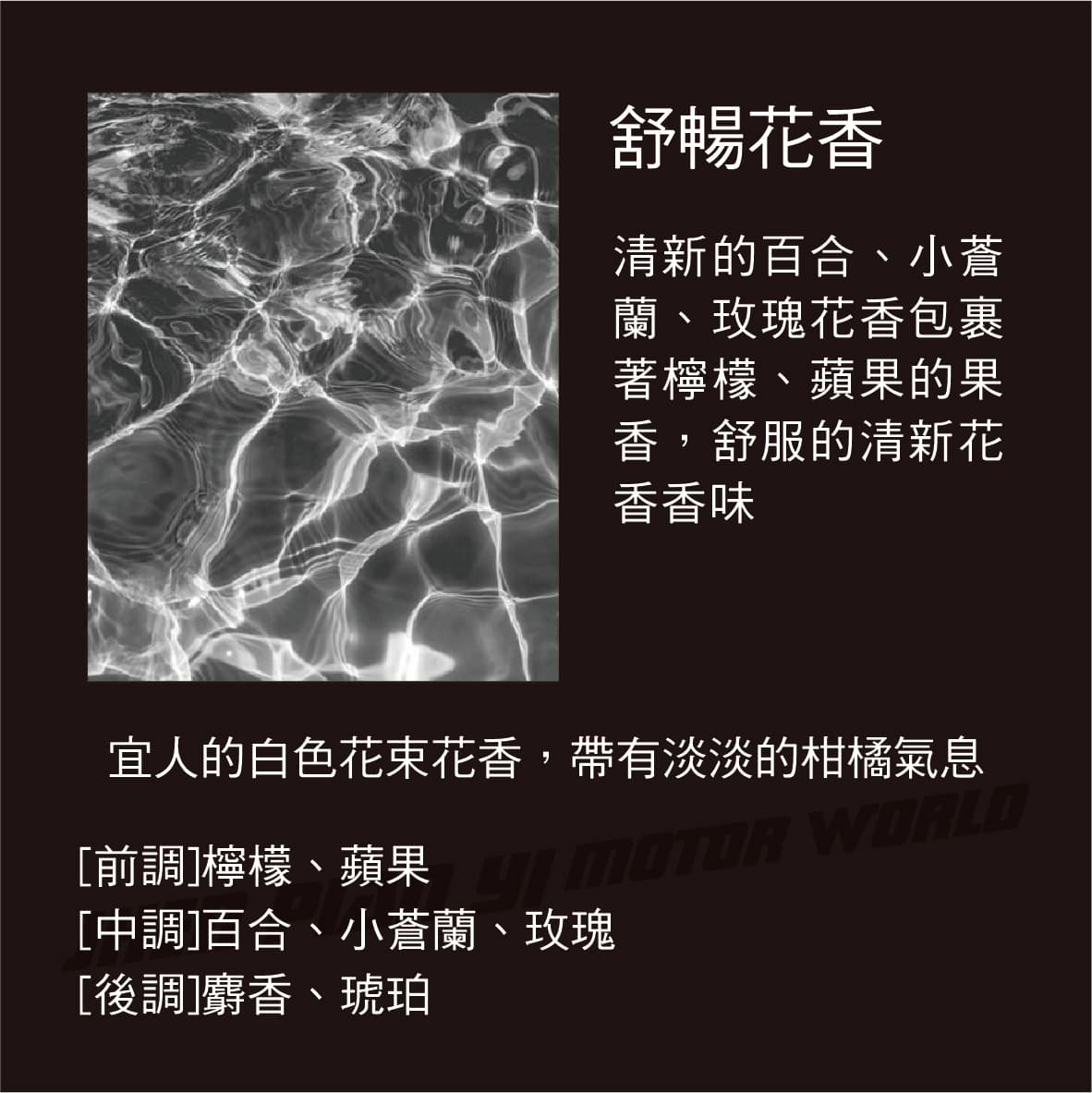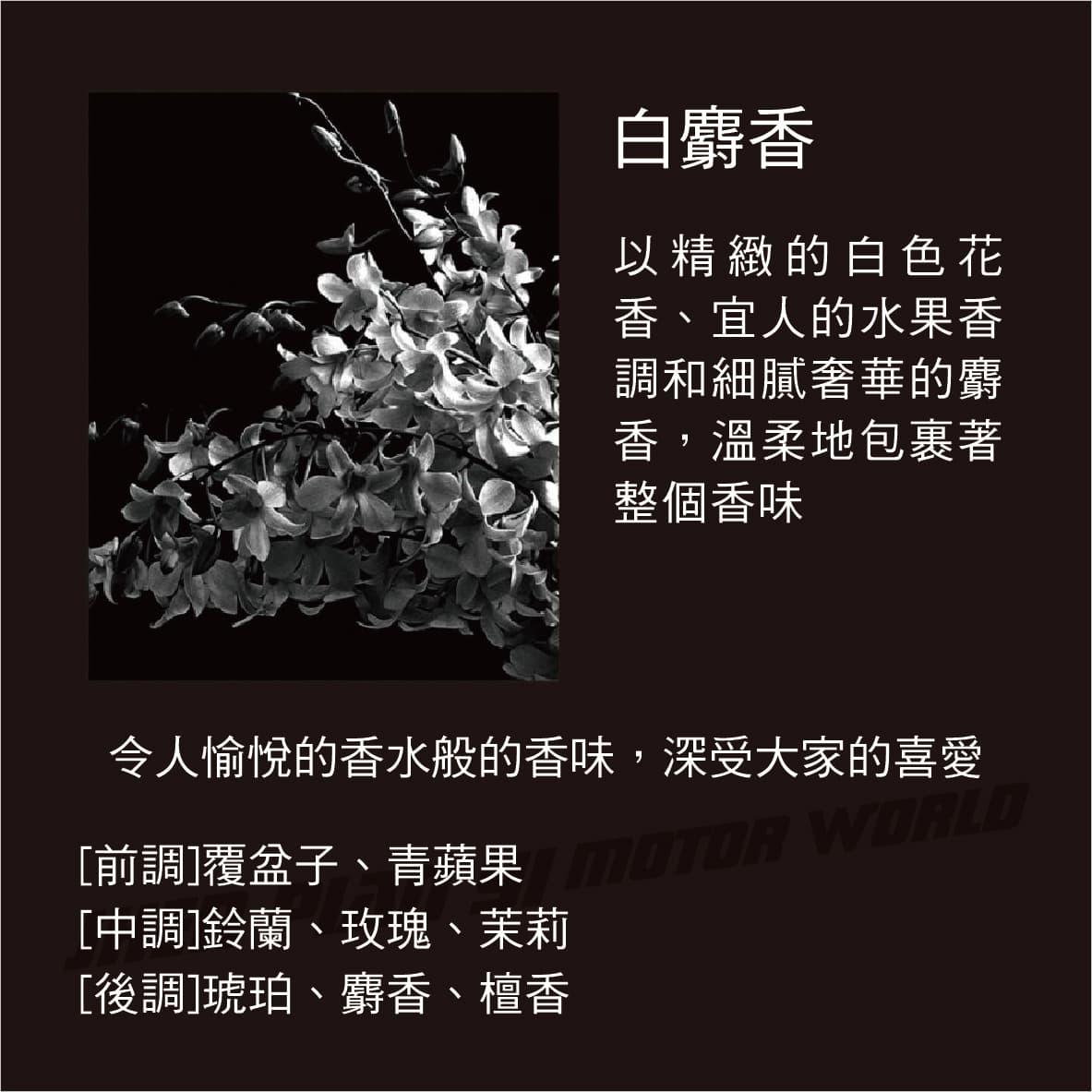◆ 這款香水專為生活簡單、追求低調美麗的人而設計 ◆ 精緻、簡潔、乾淨的黑色瓶身極簡設計 ◆ 含有消臭成分,散發怡人的香味,同時去除車內異味 ◆ 輕巧瓶身,可放置在車內飲料架、門邊或儀表板上 ◆ 採用吸水聚合物製成,散發濃郁的香氣 ◆ 香味約可持續30-45天(持續時間依使用環境而異) 白麝香-令人愉悅的香水般的香味,深受大家的喜愛 以精緻的白色花香、宜人的水果香調和細膩奢華的麝香,溫柔地包裹著整個香味 [前調]覆盆子、青蘋果 [中調]鈴蘭、玫瑰、茉莉 [後調]琥珀、麝香、檀香 花卉浴香-帶有花香略帶甜味的麝香與琥珀層次的香味 融合黑醋栗、檸檬、梨的果香、鈴蘭和玫瑰的花香,搭配麝香、琥珀多層次香味 [前調]檸檬、黑醋栗、梨子 [中調]玫瑰、鈴蘭、小蒼蘭、康乃馨、茉莉 [後調]香草、琥珀、麝香 舒暢花香-宜人的白色花束花香,帶有淡淡的柑橘氣息 清新的百合、小蒼蘭、玫瑰花香包裹著檸檬、蘋果的果香,舒服的清新花香香味 [前調]檸檬、蘋果 [中調]百合、小蒼蘭、玫瑰 [後調]麝香、琥珀