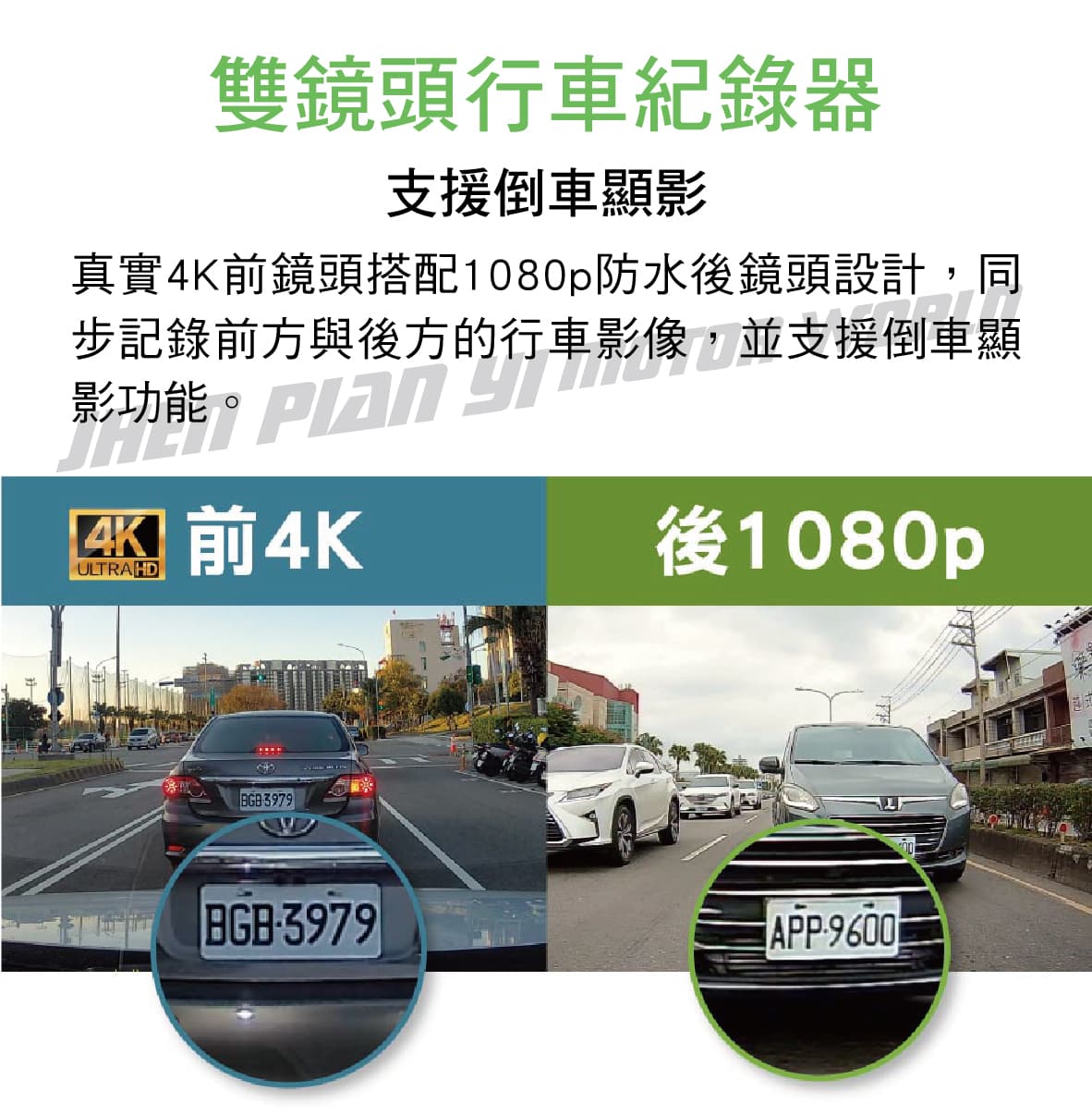 ◆ 真實4K前鏡頭搭配1080p防水後鏡頭設計,同步記錄前方與後方的行車影像