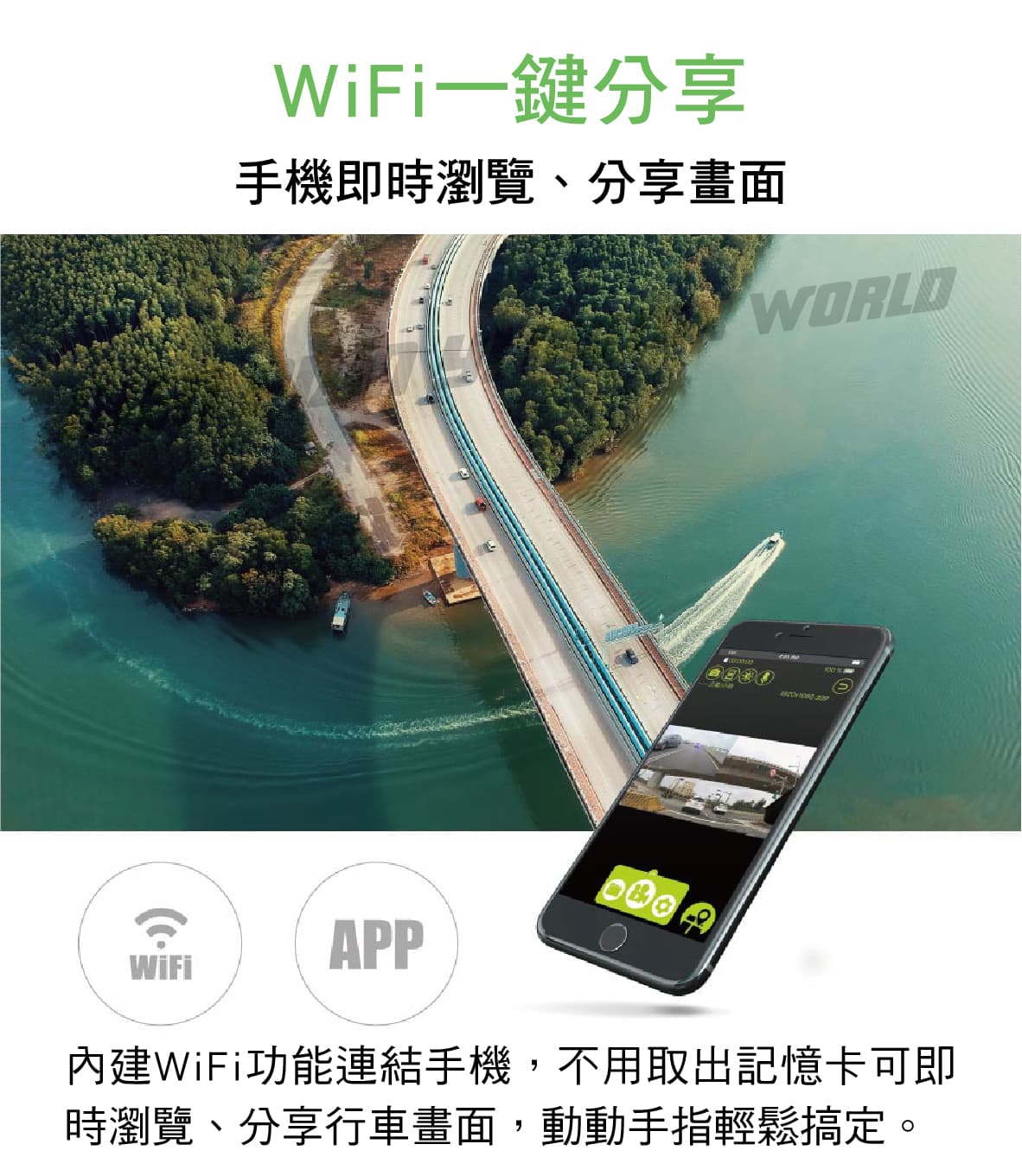 ◆ 內建WiFi功能連結手機,即時瀏覽、分享行車畫面