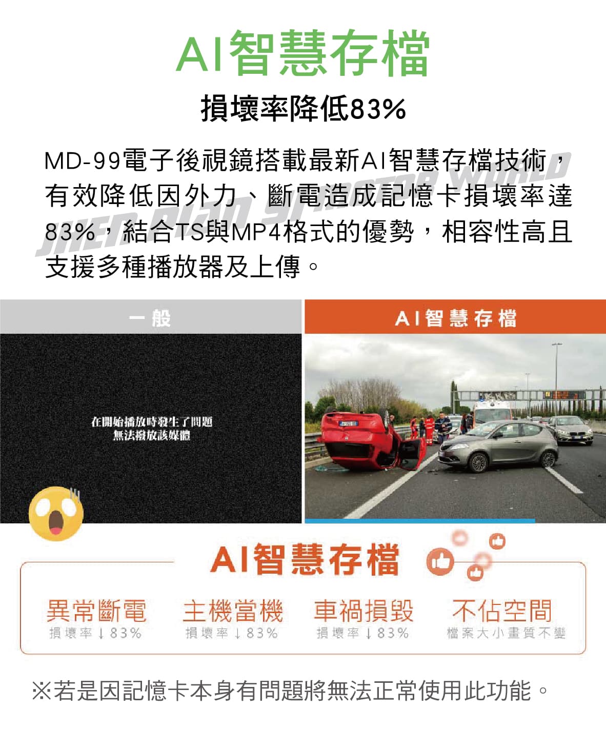 ◆ 搭載最新AI智慧存檔技術,有效降低因外力、斷電造成記憶卡損壞率