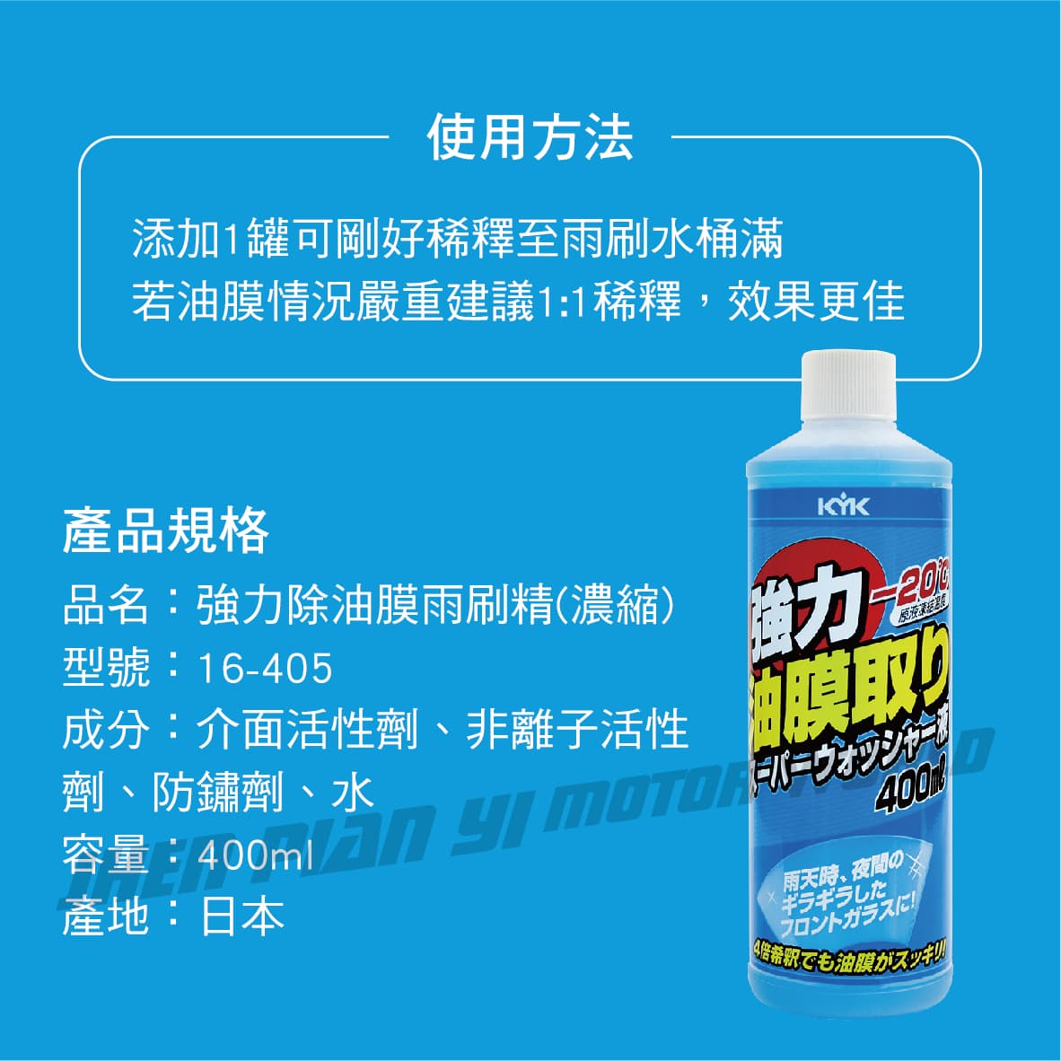 ◆ 強力去除頑固油膜髒汙 ◆ 不會傷害車窗邊塑膠和車漆,請安心使用 ◆ 環保新技術、獨家配方 ◆ 清潔更有效、更環保,保護玻璃及膠條 使用方法 添加1罐可剛好稀釋至雨刷水桶滿 若油膜情況嚴重建議1:1稀釋,效果更佳