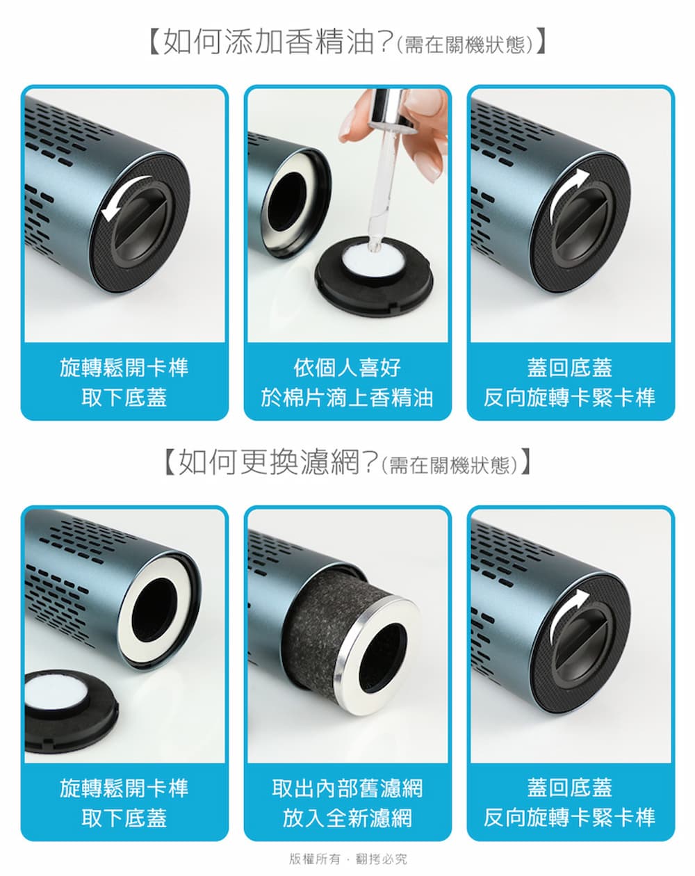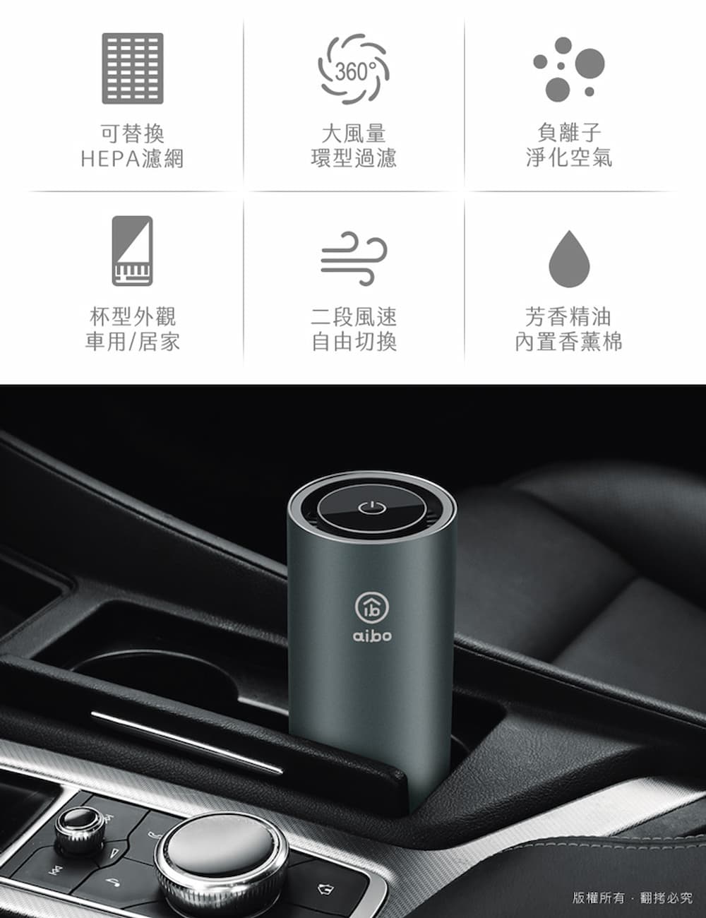 ◆ 可替換HEPA高效濾網,三層構造有效過濾淨化 ◆ 去除空氣中各種汙染,淨化PM2.5過敏原 ◆ 釋放800萬高密度負離子淨化,有效改善空氣品質 ◆ 二段式風量,觸控式設計、風力自由切換 ◆ 360度環型過濾,空氣循環流動更快,有效循環到每一處角落 ◆ 內置香薰棉,可自由添加精油,芳香療癒 ◆ 鋁合金杯身設計,適合放於車內杯架