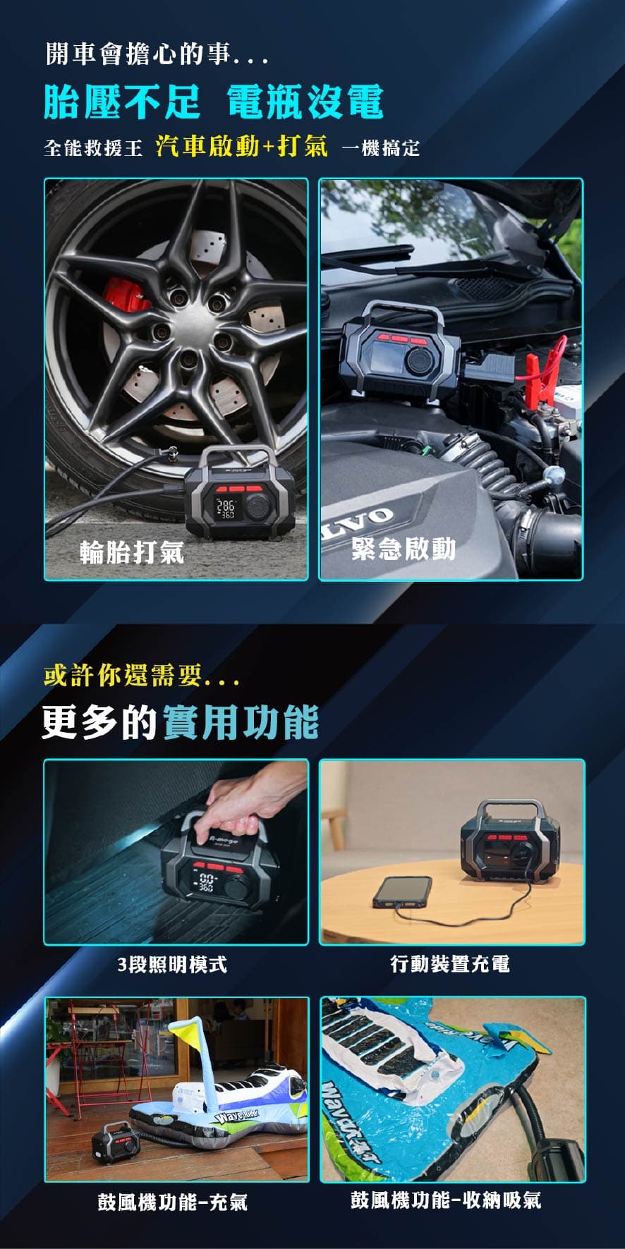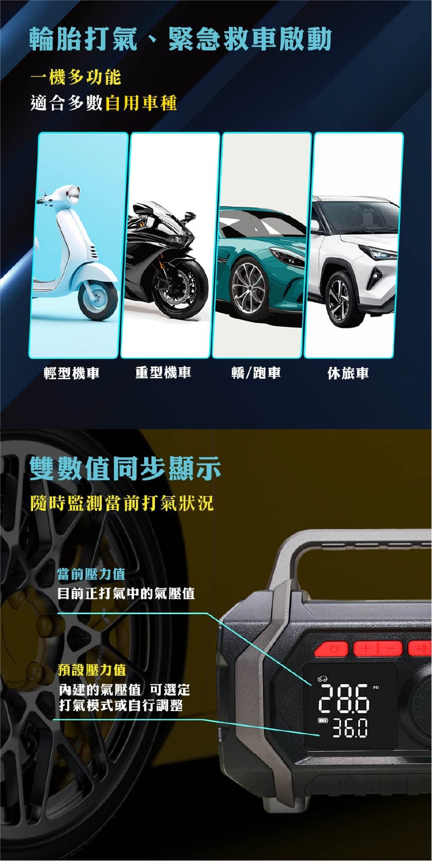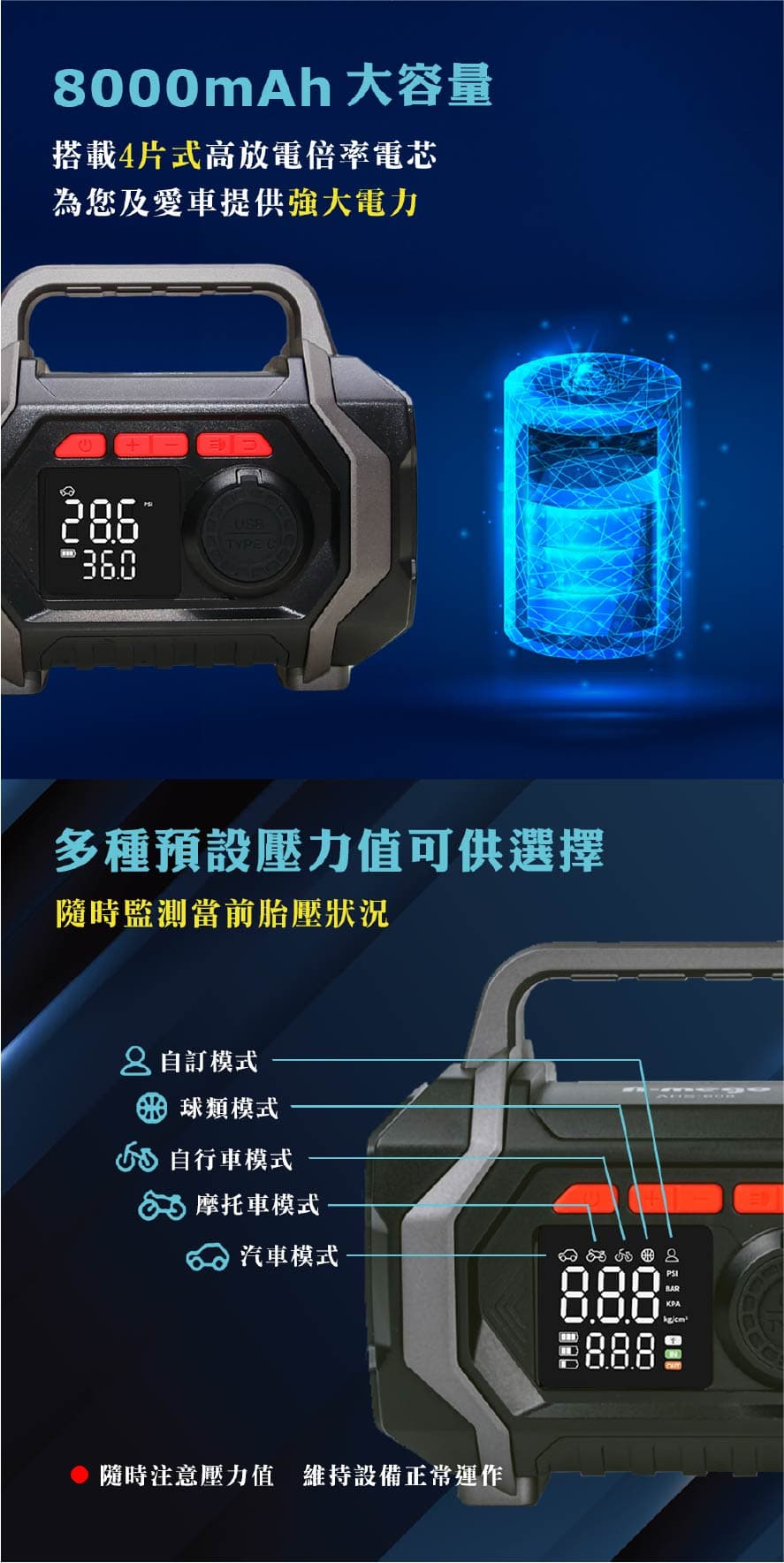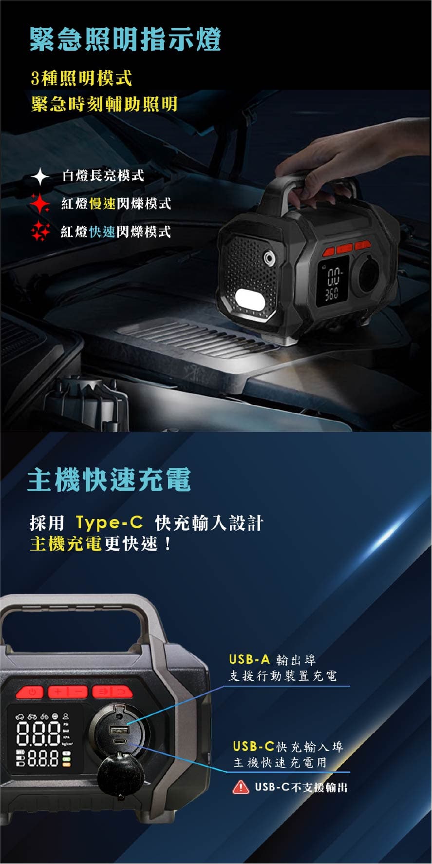 ‧六合一 救車、打氣、抽氣、吹氣、照明、充電 一機搞定 ‧內建 8000mAh 大容量,搭載四片高效電芯 ‧支援 12V 汽油 3500cc/柴油 2200cc 以下車輛,關鍵時刻即刻救援 ‧滿電電壓達 16.8V,可支援 16V 以下電動車電池 ‧打氣機功能:鋁合金 19mm 氣缸,支援緊急快速補氣 多種預設模式(汽車、機車、自行車、籃球),最高可達 150 PSI ‧內建高流量鼓風機,隨附多款氣嘴,可用於充氣床墊、泳圈等 ‧極致輕量 0.8kg,手提設計單手即可輕鬆提取 ‧智能螢幕即時顯示電量與雙胎壓數值,操作直覺易懂 ‧高亮度 LED 照明+SOS 模式,夜間或緊急狀況皆能安心應對 ‧配備 Type-C 輸入快充孔,支援主機快速充電 ‧多重安全保護機制:過充、過放、短路、防逆接,使用更放心
