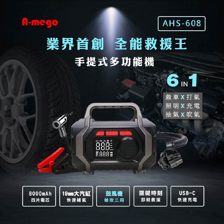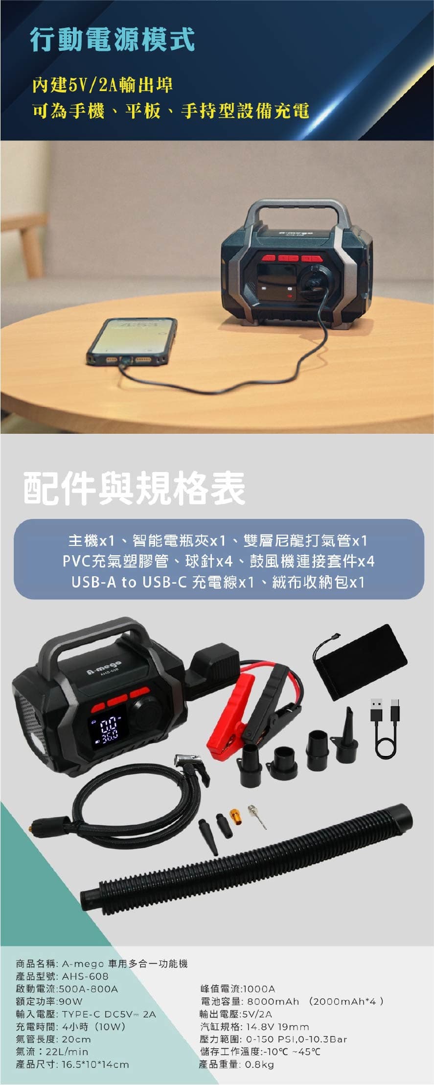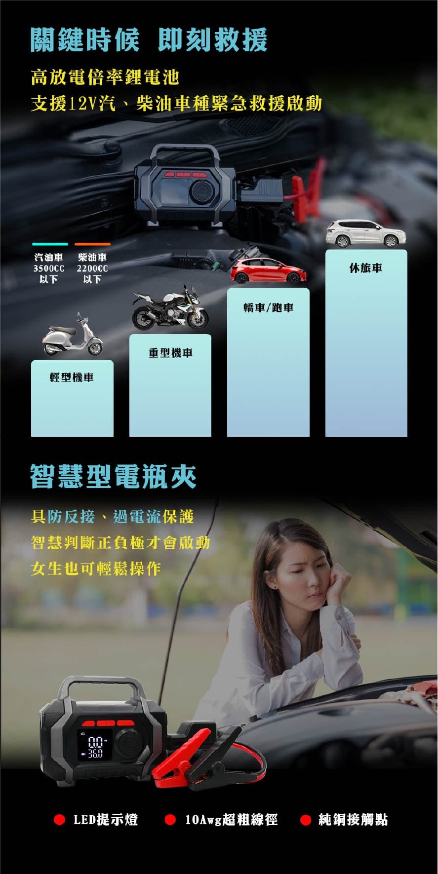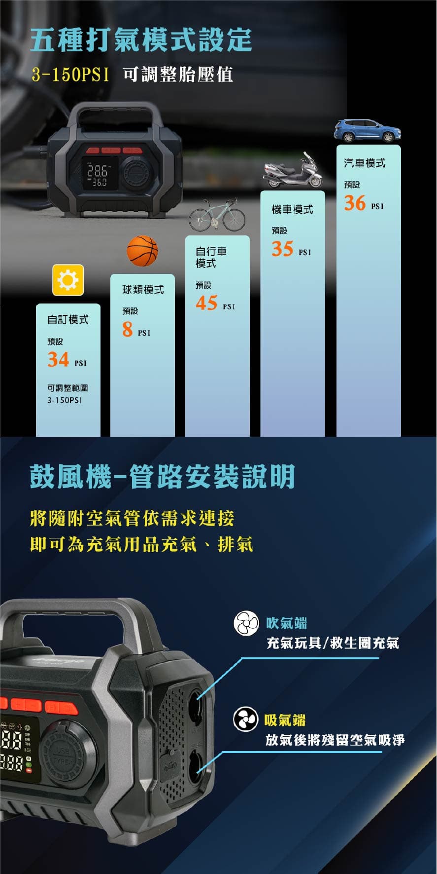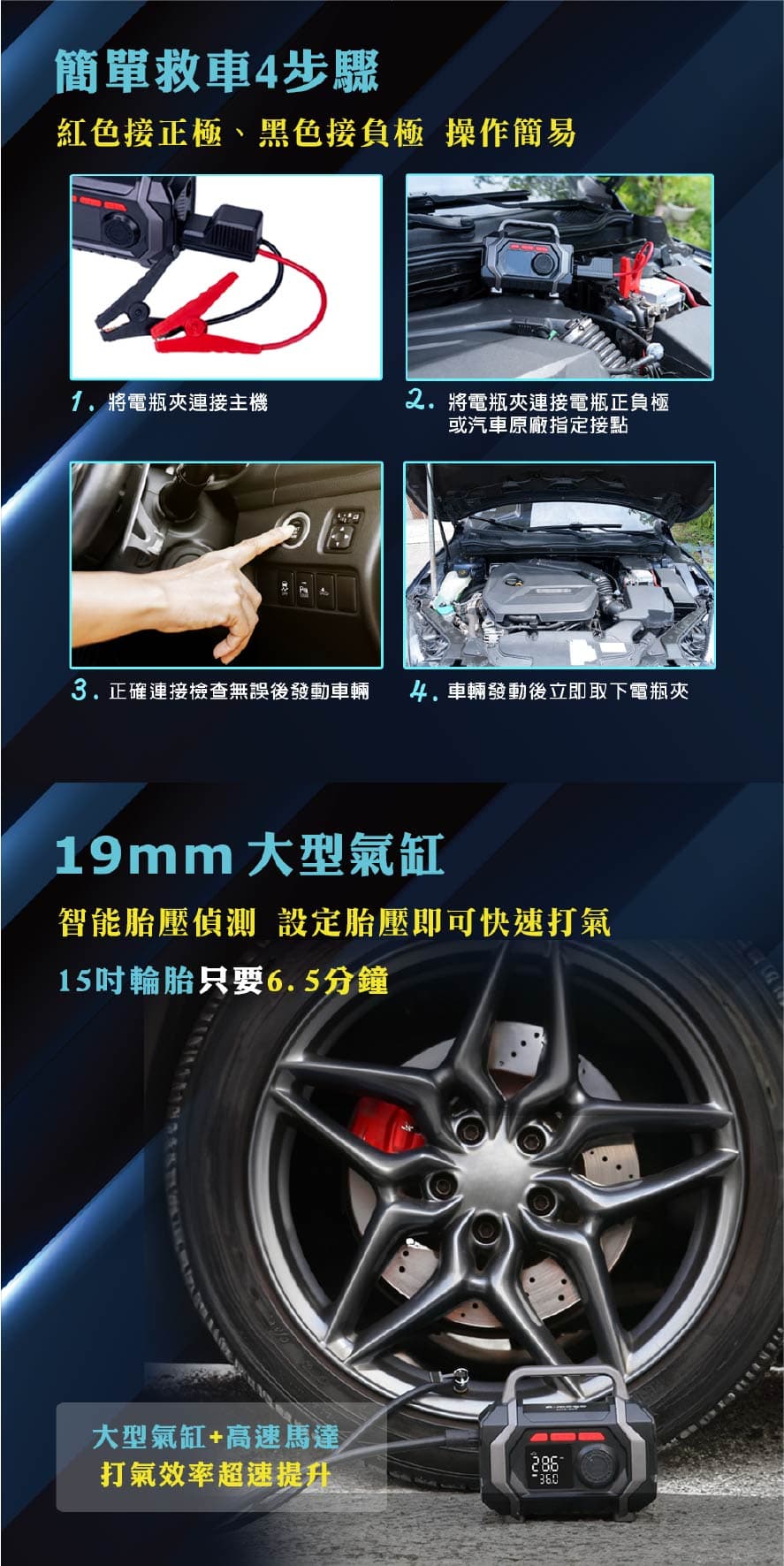 ‧六合一 救車、打氣、抽氣、吹氣、照明、充電 一機搞定 ‧內建 8000mAh 大容量,搭載四片高效電芯 ‧支援 12V 汽油 3500cc/柴油 2200cc 以下車輛,關鍵時刻即刻救援 ‧滿電電壓達 16.8V,可支援 16V 以下電動車電池 ‧打氣機功能:鋁合金 19mm 氣缸,支援緊急快速補氣 多種預設模式(汽車、機車、自行車、籃球),最高可達 150 PSI ‧內建高流量鼓風機,隨附多款氣嘴,可用於充氣床墊、泳圈等 ‧極致輕量 0.8kg,手提設計單手即可輕鬆提取 ‧智能螢幕即時顯示電量與雙胎壓數值,操作直覺易懂 ‧高亮度 LED 照明+SOS 模式,夜間或緊急狀況皆能安心應對 ‧配備 Type-C 輸入快充孔,支援主機快速充電 ‧多重安全保護機制:過充、過放、短路、防逆接,使用更放心