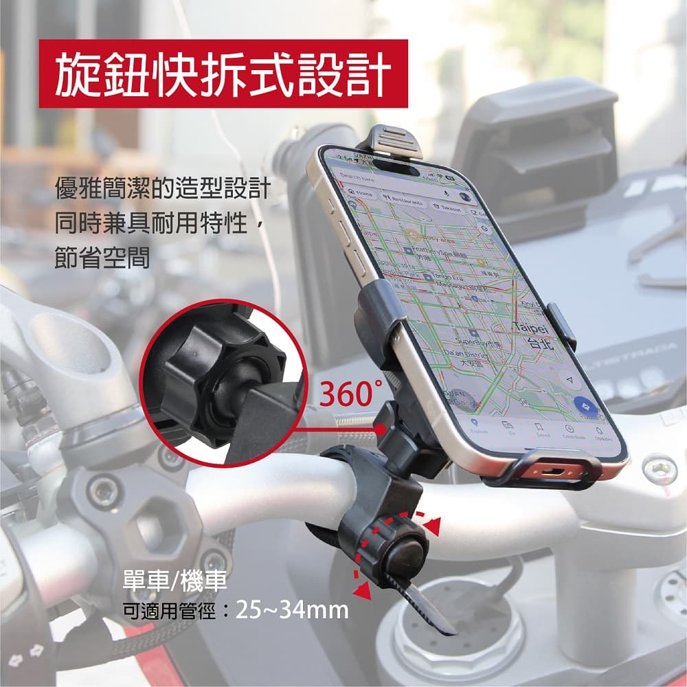 ◆ 適合手把管徑25-34mm內 ◆ PU條設計,穩固不鬆脫 ◆ 適用於4.0~6.3吋手機 ◆ 四邊伸縮夾臂設計 ◆ 固定鎖設計不鬆脫 ◆ 方便單手取拿手機 ◆ 附防滑PU條