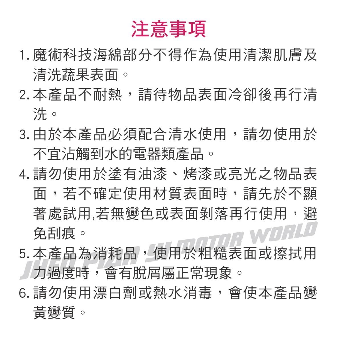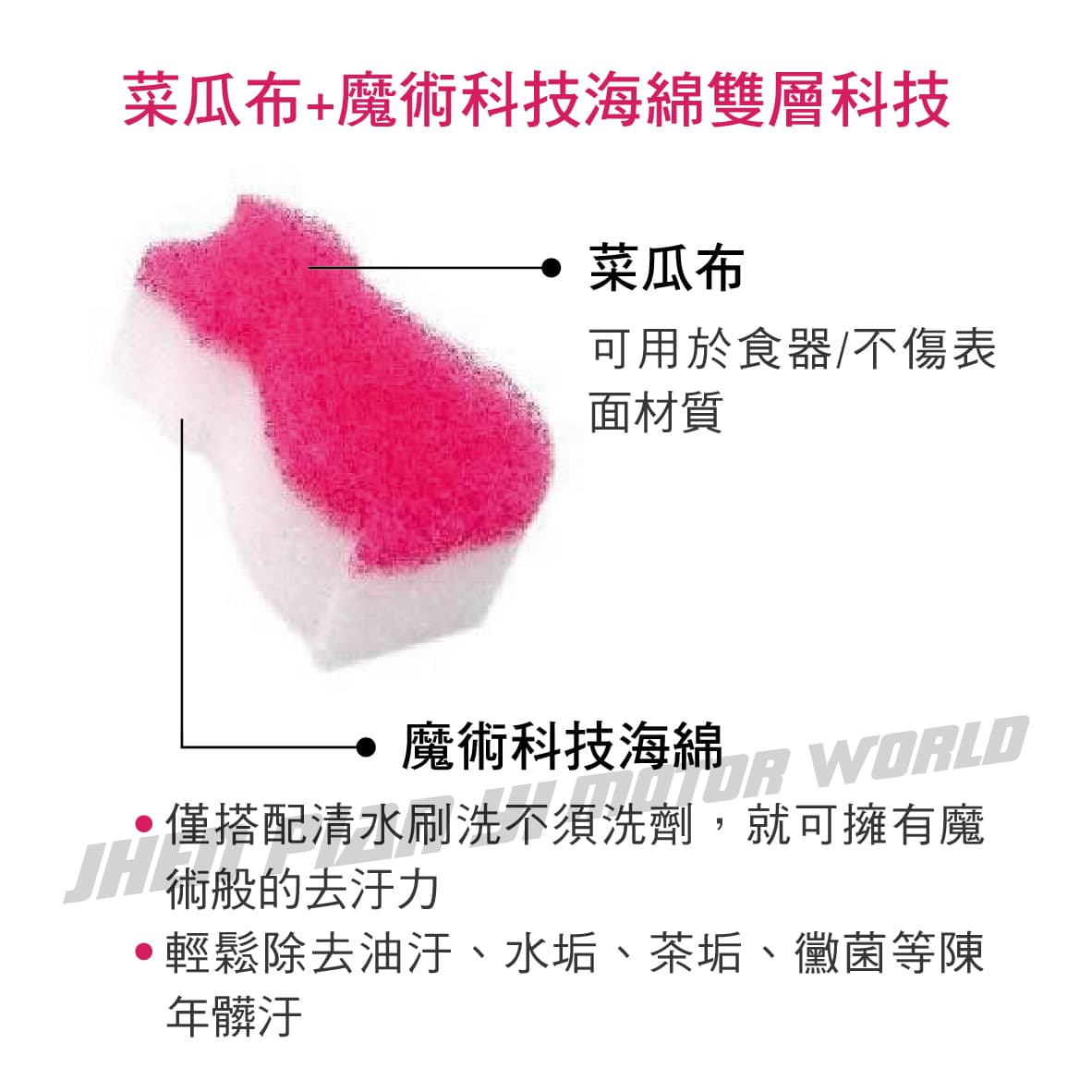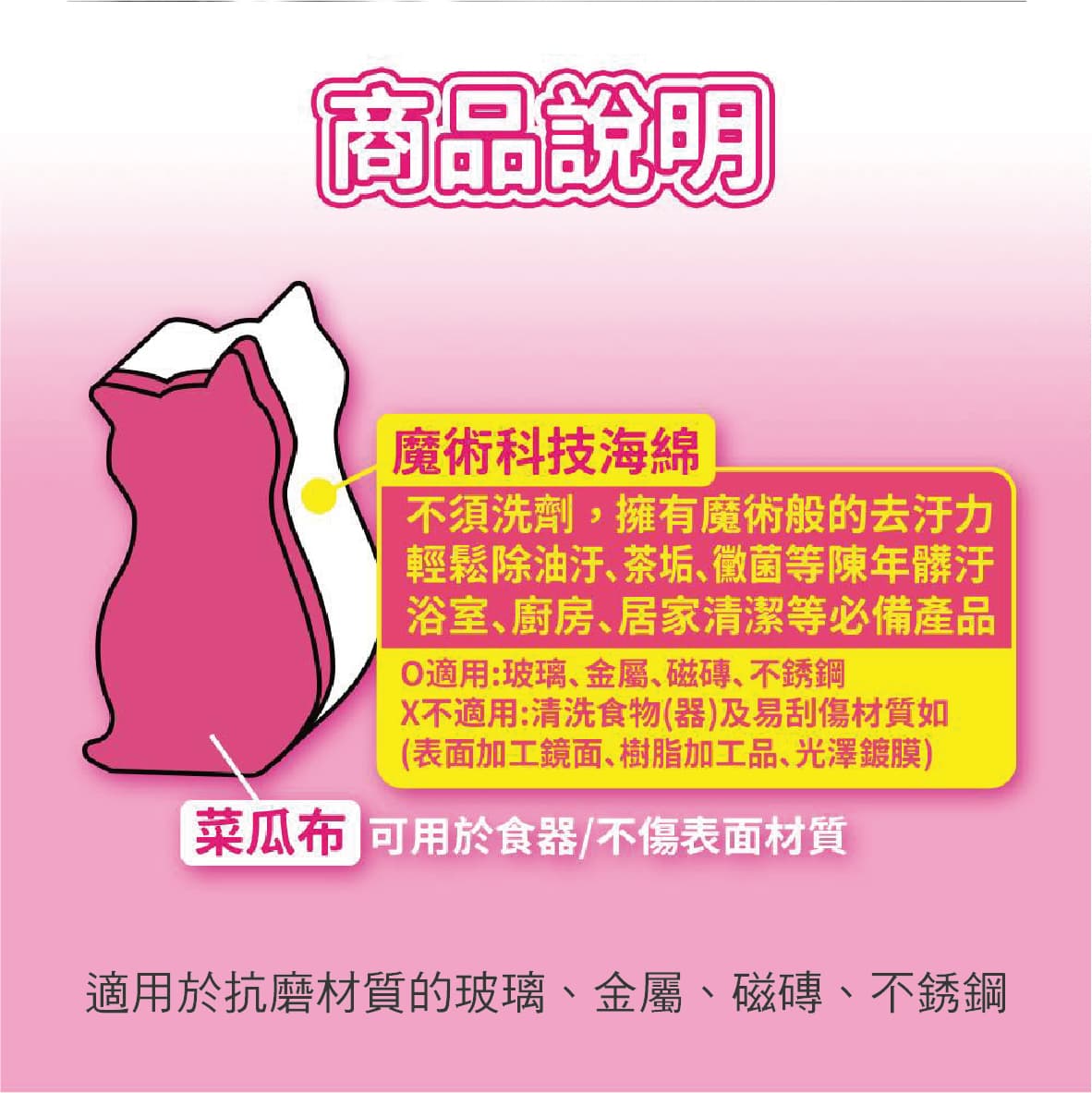 ◆ 菜瓜布+魔術科技海綿雙層科技 ◆ 菜瓜布:可用於食器/不傷表面材質 ◆ 魔術科技海綿:僅搭配清水刷洗不須洗劑,就可擁有魔術般的去汙力 ◆ 輕鬆除去油汙、水垢、茶垢、黴菌等陳年髒汙 ◆ 浴室、廚房、居家清潔等必備產品 ◆ 適用於抗磨材質的玻璃、金屬、磁磚、不銹鋼 ※不適用:清洗食物(器)及易刮傷材質如表面加工鏡面、樹脂加工品、光澤鍍膜