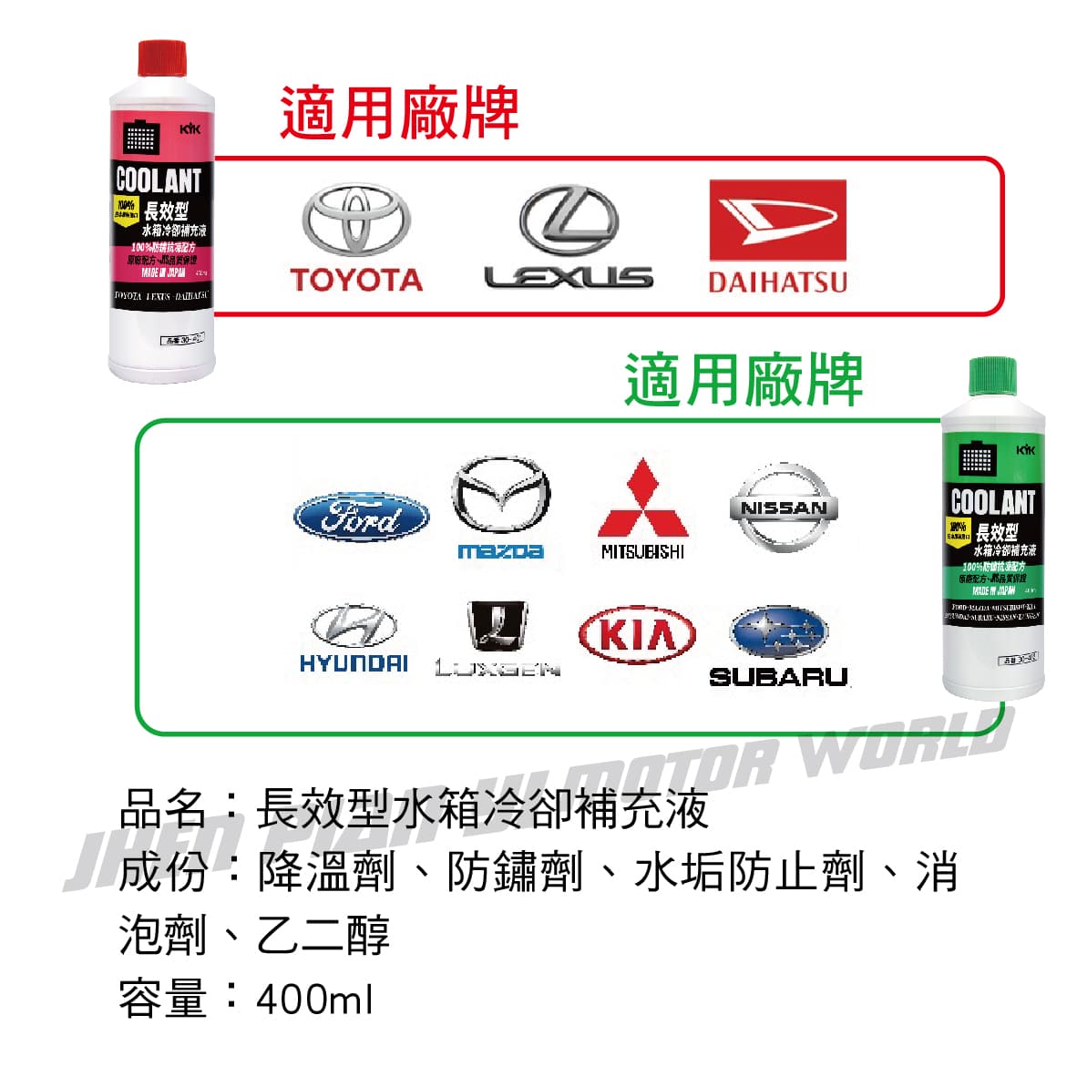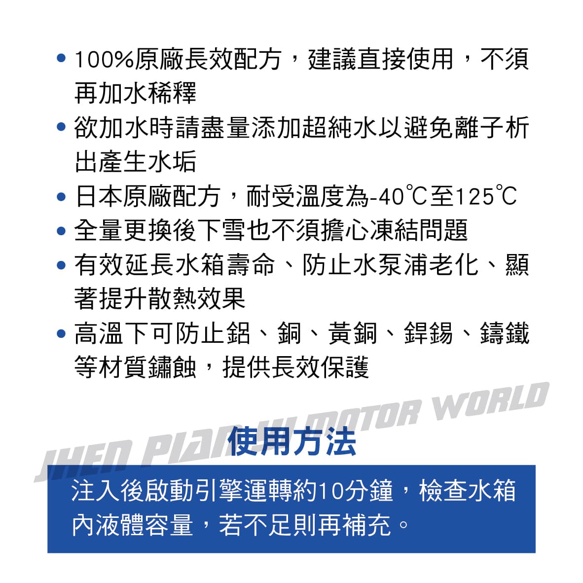 ◆ 100%防鏽抗凍配方,原廠配方、JIS品質保證 ◆ 100%原廠長效配方,建議直接使用,不須再加水稀釋 ◆ 欲加水時請盡量添加超純水以避免離子析出產生水垢 ◆ 日本原廠配方,耐受溫度為-40℃至125℃ ◆ 全量更換後下雪也不須擔心凍結問題 ◆ 有效延長水箱壽命、防止水泵浦老化、顯著提升散熱效果 ◆ 高溫下可防止鋁、銅、黃銅、銲錫、鑄鐵等材質鏽蝕,提供長效保護