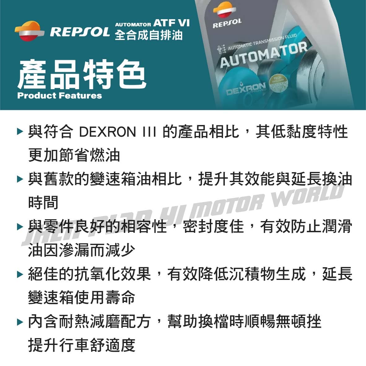 ‧與符合 DEXRON III 的產品相比,其低黏度特性更加節省燃油 ‧與舊款的變速箱油相比,提升其效能與延長換油時間 ‧與零件良好的相容性,密封度佳,有效防止潤滑油因滲漏而減少 ‧絕佳的抗氧化效果,有效降低沉積物生成,延長變速箱使用壽命 ‧內含耐熱減磨配方,幫助換檔時順暢無頓挫提升行車舒適度