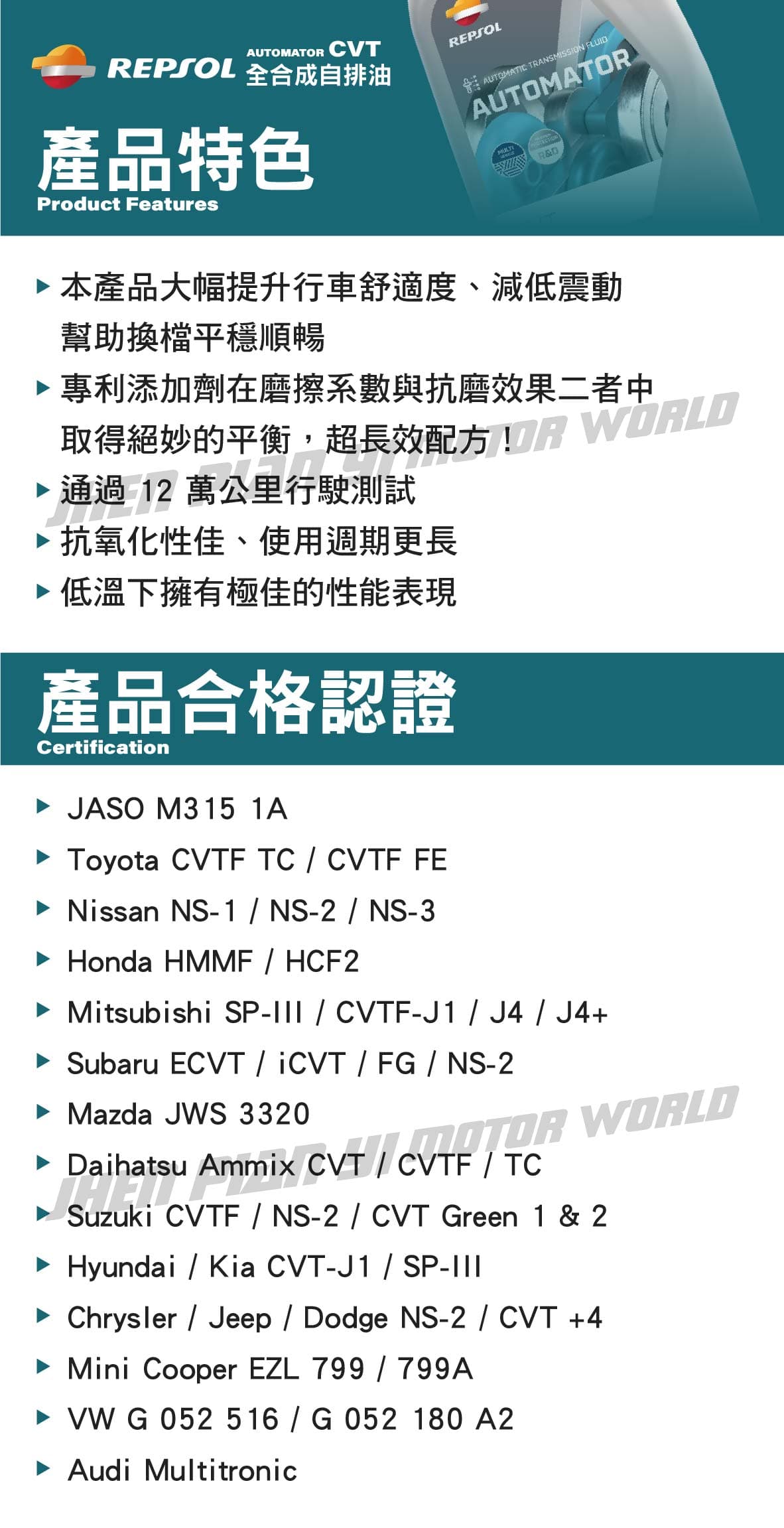 ‧專為最新型無段變速箱(CVT)系統所設計 ‧無論是鏈帶式或鋼帶式 CVT 都可使用 ‧亞洲車種尤其推薦 ‧本產品大幅提升行車舒適度、減低震動幫助換檔平穩順暢 ‧專利添加劑在磨擦系數與抗磨效果二者中取得絕妙的平衡,超長效配方! ‧通過 12 萬公里行駛測試 ‧抗氧化性佳、使用週期更長 ‧低溫下擁有極佳的性能表現