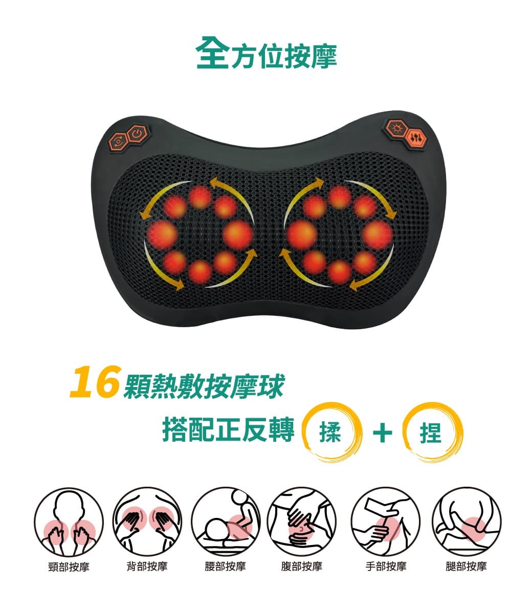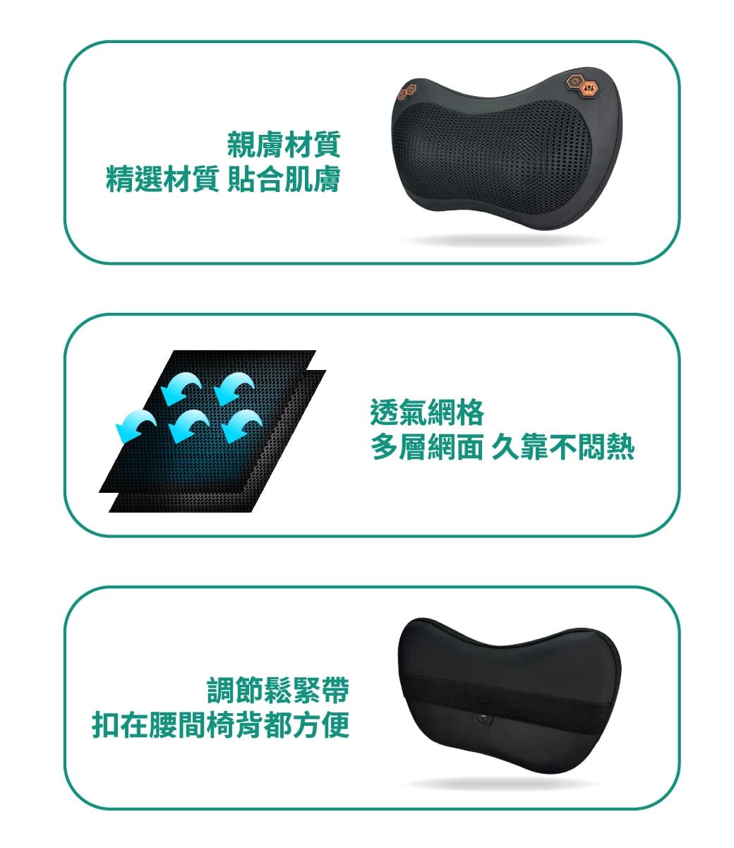 ◆ 四鍵獨立設計 ◆ 16顆3D按摩頭,仿真人按摩 ◆ 溫感效果、三速調控 ◆ 15分鐘自動定時 ◆ 親膚材質,貼合肌膚 ◆ 透氣網格,久靠不悶熱 ◆ 調節鬆緊帶,扣在腰間椅背都方便 ◆ 內附車用電源線及家用變壓器