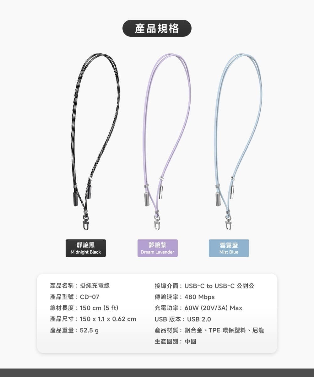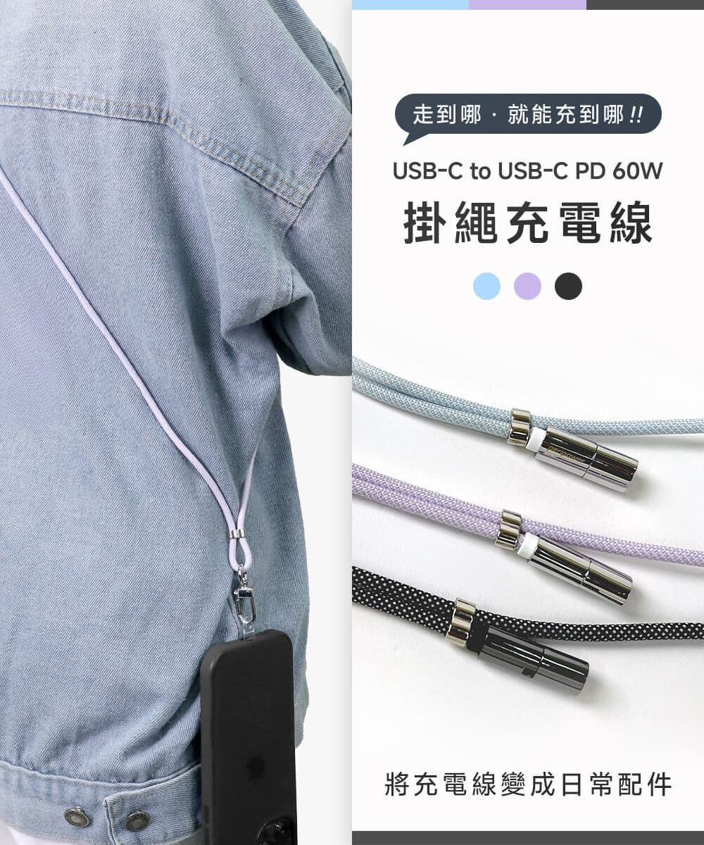 ◆ 充電與掛繩二合一設計,隨時隨地輕鬆使用,減少遺失風險 ◆ 既是手機掛繩,也是充電線,一條滿足多種需求 ◆ 無論是旅行、通勤還是戶外活動,都能輕鬆應對 ◆ 多色風格搭配,讓充電配件也能成為穿搭亮點 ◆ 防纏繞、高耐用設計,提供穩定耐久的使用體驗 ◆ 傳輸速率480Mbps,讓資料高速同步分享 ◆ 60W PD快充支援,節省等待充電的時間 ◆ 背帶可調節,斜背、肩背、頸掛都能隨心所欲