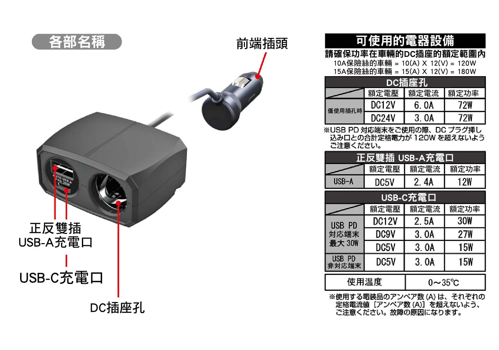 ‧延長式三孔擴充插座:DC插座/Type-C/USB-A,USB雙孔合計最大輸出42W ‧支援 12V/24V 電源適合多種車輛使用 ‧Type-C支援PD快充最大30W輸出 ‧USB-A內建自動識別IC系統,針對不同裝置提供最佳充電效果,輸出最高12W ‧採用可正反插的 USB-A 充電孔設計,無需分辨正反面即可插入 ‧DC 插座:最大輸出 72W ‧帶有約1m長的電源線可自由選擇安裝位置 ‧配備藍色發光指示燈,通電自動發亮 ‧BSMI:R3D178