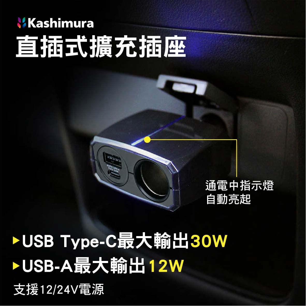 ‧直插式三孔擴充插座:DC插座/Type-C/USB-A,USB雙孔合計最大輸出42W ‧支援 12V/24V 電源適合多種車輛使用 ‧Type-C支援PD快充最大30W輸出 ‧USB-A內建自動識別IC系統,針對不同裝置提供最佳充電效果,輸出最高12W ‧採用可正反插的 USB-A 充電孔設計,無需分辨正反面即可插入 ‧DC 插座:最大輸出 72W ‧配備藍色發光指示燈,通電自動發亮 ‧BSMI:R3D178