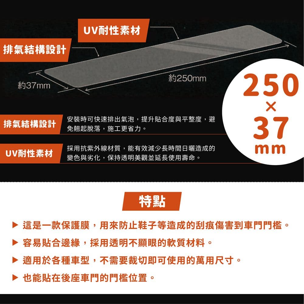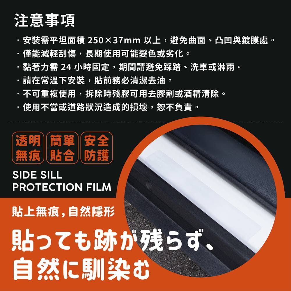 ◆ 採用高透明軟質材質製成,能完美貼合車門門檻邊緣 ◆ 有效防止鞋底或行李刮傷車體塗裝 ◆ 清晰透明的設計不影響車輛外觀,維持原有質感與美觀 ◆ 產品為通用尺寸設計,多數車款皆可直接使用 ◆ 無需裁切,安裝簡單方便 ◆ 防刮、防汙、耐磨的特性可長期保護車門門檻,讓車內出入口保持如新