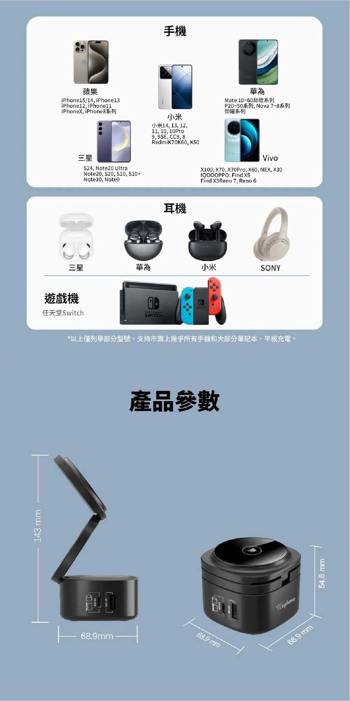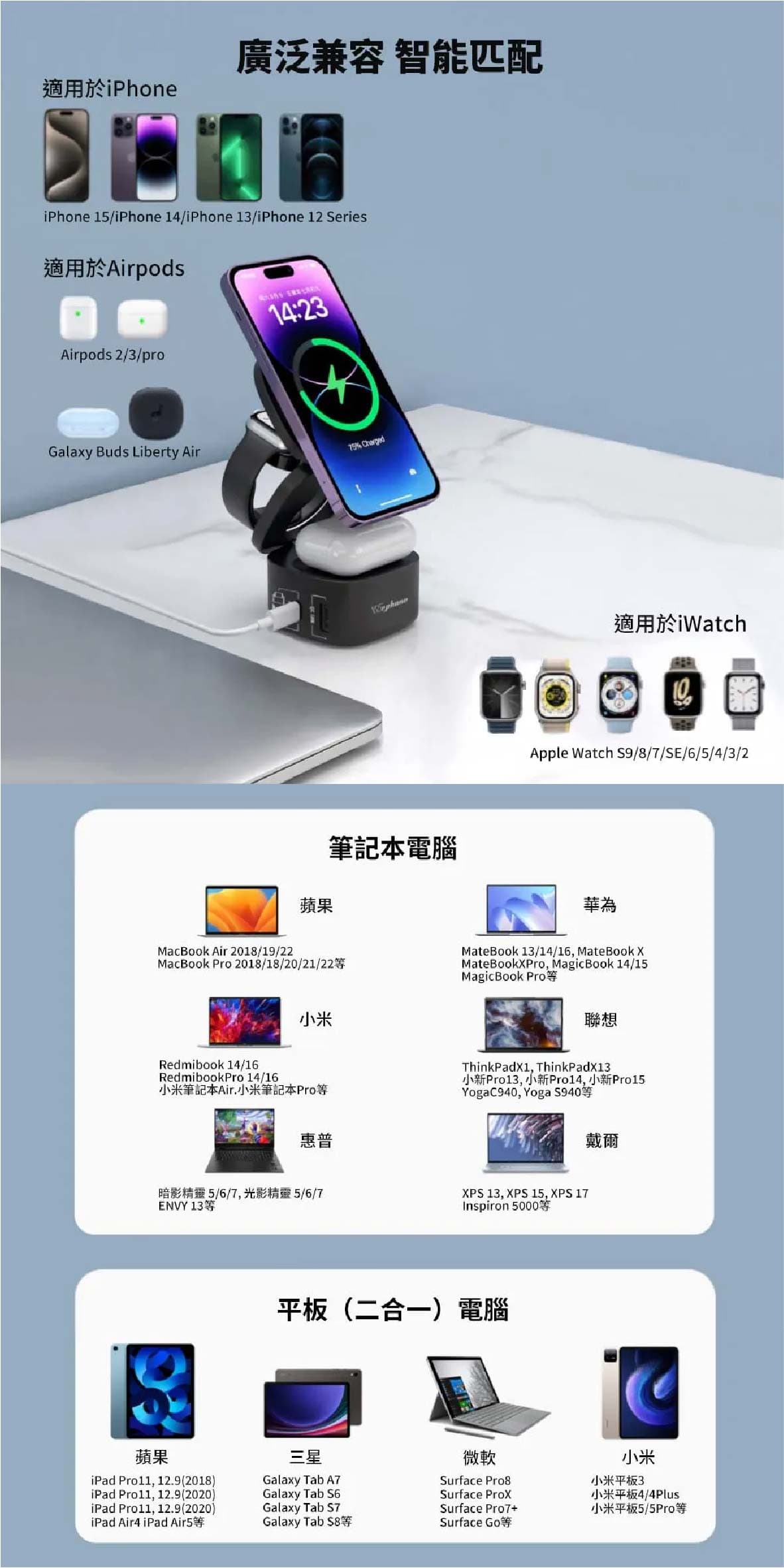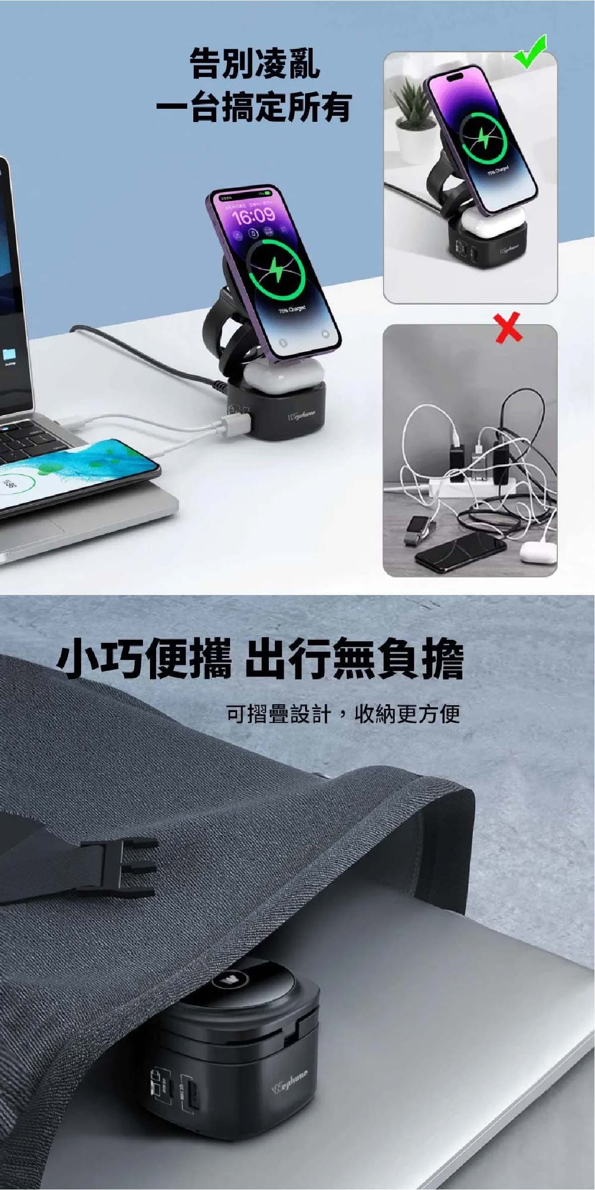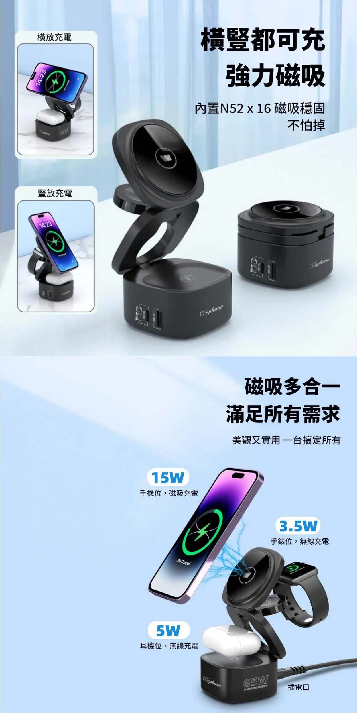 ‧強力磁鐵 橫豎都可充 內置N52x16磁吸穩固不怕掉 ‧磁吸無線充電多合一 滿足所有需求:手機位15W∕耳機位5W∕手錶位3.5W ‧65W氮化鎵超快充電,快速充電不發燙 ‧即放即充 帶殼也能充,5mm感應距離充電更靈敏 ‧告別凌亂一台搞定,小巧便攜 出行無負擔 ‧五合一讓充電更方便 可展開摺疊任何角度 ‧0-45°靈活調節自由度更高,隨意調整每個高度都穩固不影響使用 ‧BSMI:R3C177 ‧NCC:CCAP24LP3680T0