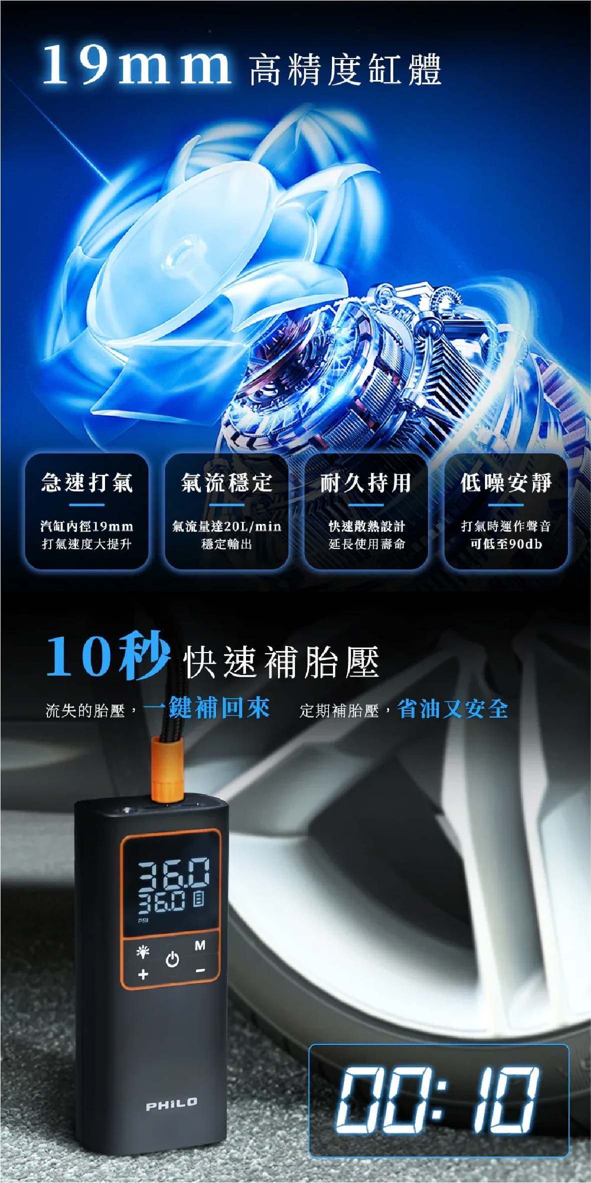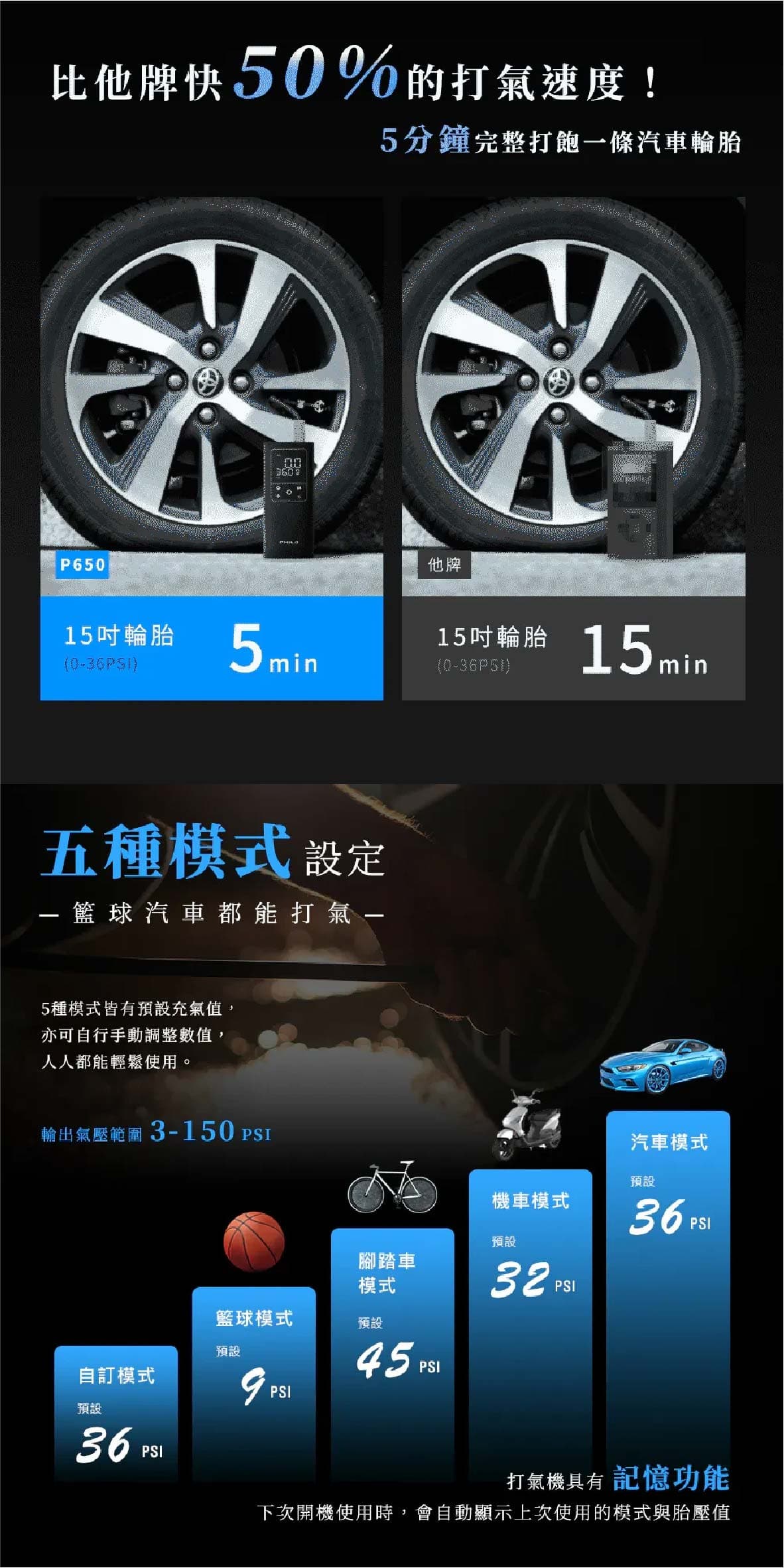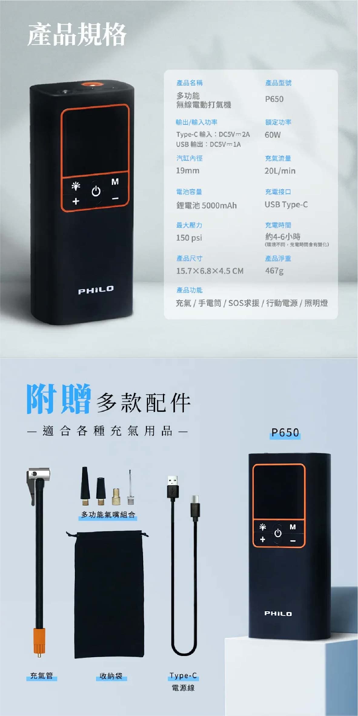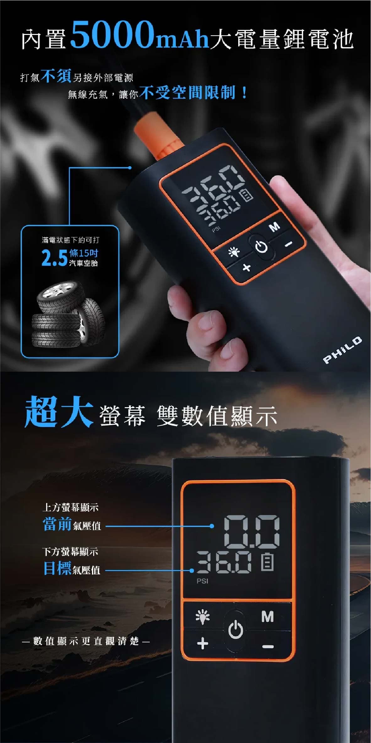 ‧19mm高精度缸體打氣速度大提升5分鐘即能完整打飽一條輪胎 ‧氣流量20L/min最快10秒流失的胎壓一鍵補回來 ‧缸體快速散熱設計延長打氣機使用壽命持久耐用 ‧打氣時運作聲音可低至90db ‧五種預設模式汽車/機車/腳踏車/籃球/自訂最高可設置150PSI ‧打氣機具有記憶功能下次開機使用時會自動顯示上次使用的模式與胎壓值 ‧內置大容量5000mAh鋰電池無線充氣最方便滿電狀態下約可打2.5條15吋汽車空胎 ‧超大螢幕可同時顯示當前氣壓值與目標氣壓值 ‧高精密感測晶片接上輪胎自動測壓顯示當前胎壓值