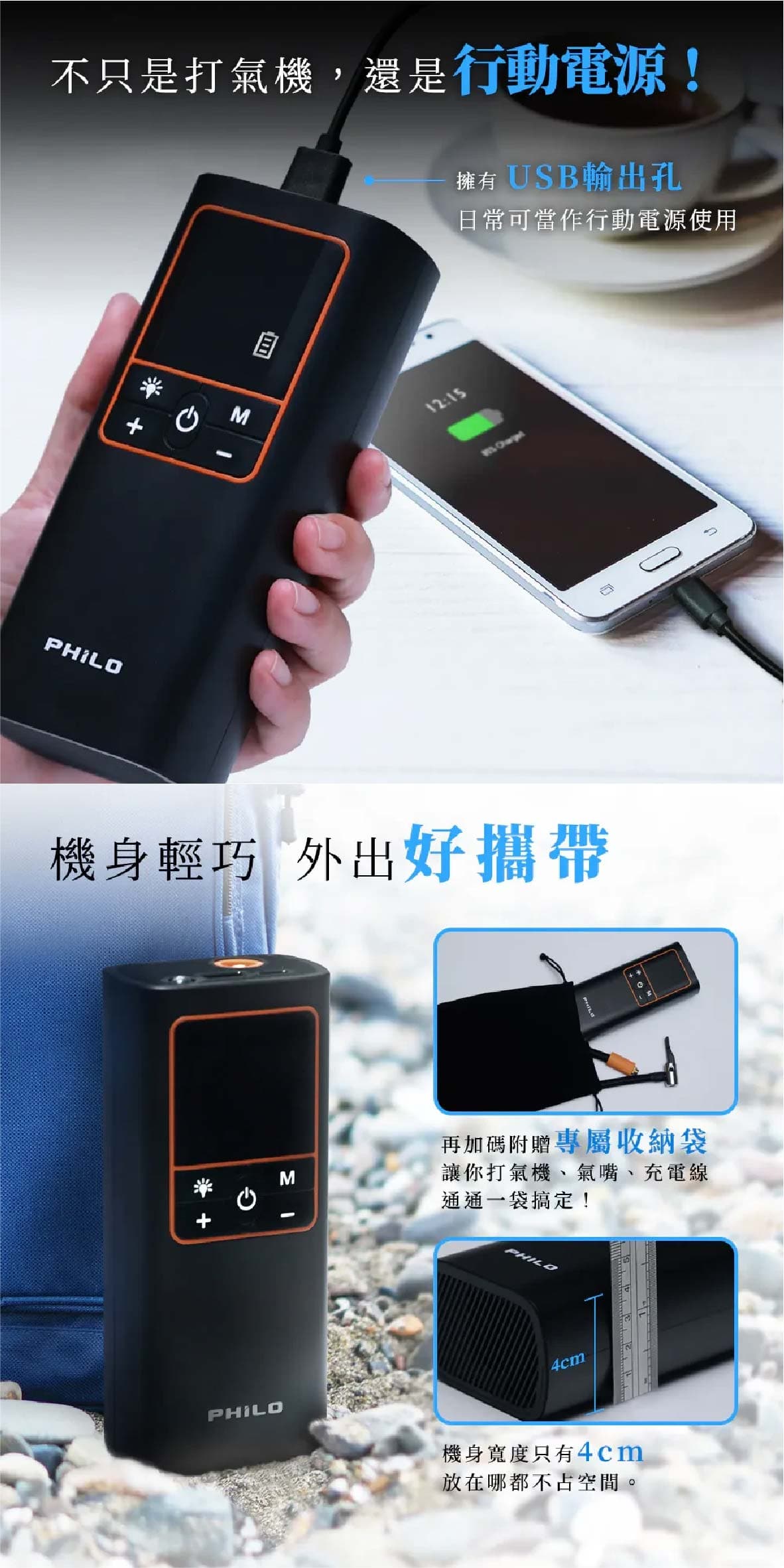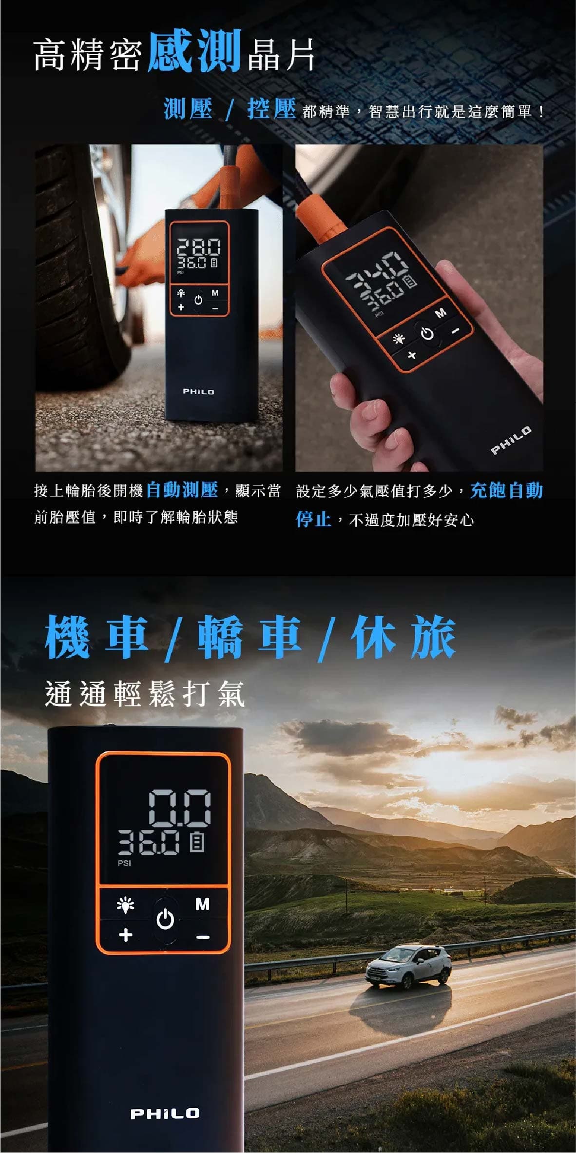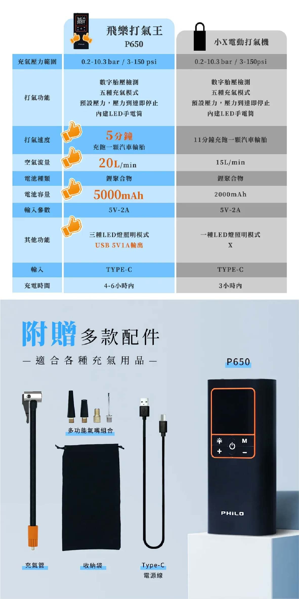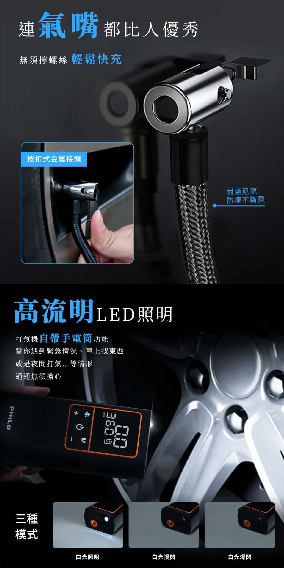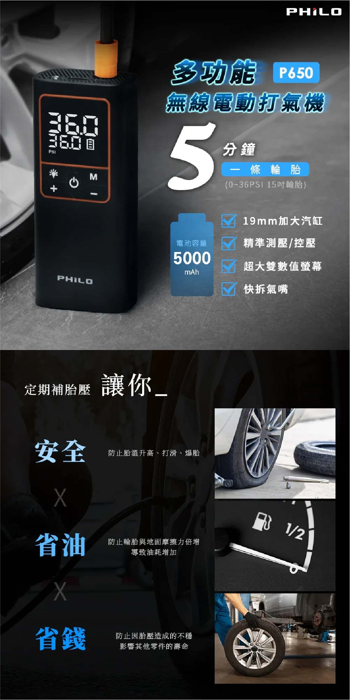 ‧19mm高精度缸體打氣速度大提升5分鐘即能完整打飽一條輪胎 ‧氣流量20L/min最快10秒流失的胎壓一鍵補回來 ‧缸體快速散熱設計延長打氣機使用壽命持久耐用 ‧打氣時運作聲音可低至90db ‧五種預設模式汽車/機車/腳踏車/籃球/自訂最高可設置150PSI ‧打氣機具有記憶功能下次開機使用時會自動顯示上次使用的模式與胎壓值 ‧內置大容量5000mAh鋰電池無線充氣最方便滿電狀態下約可打2.5條15吋汽車空胎 ‧超大螢幕可同時顯示當前氣壓值與目標氣壓值 ‧高精密感測晶片接上輪胎自動測壓顯示當前胎壓值
