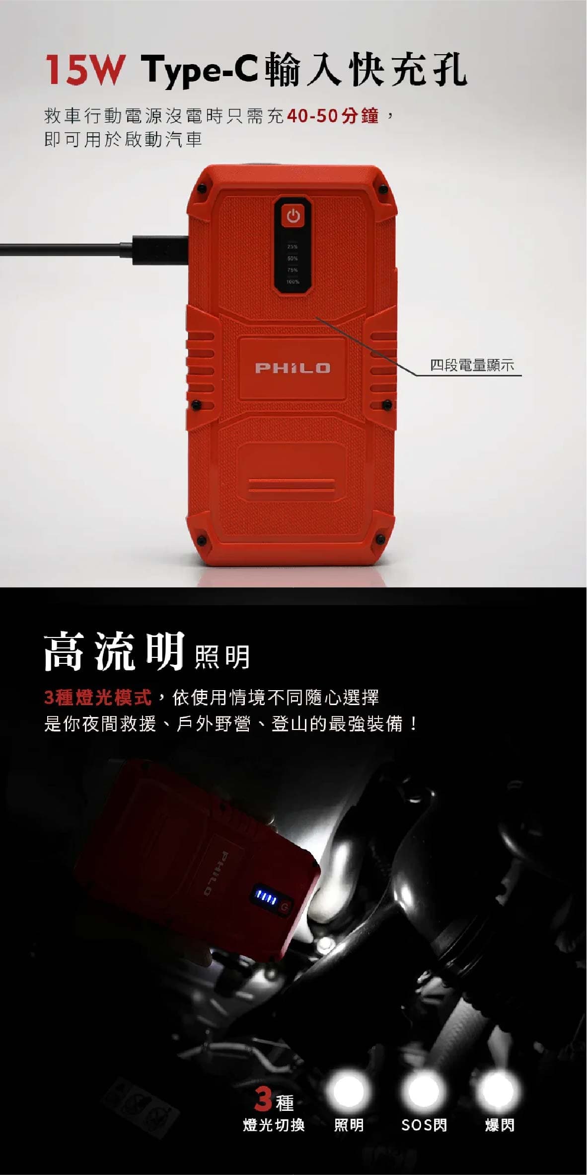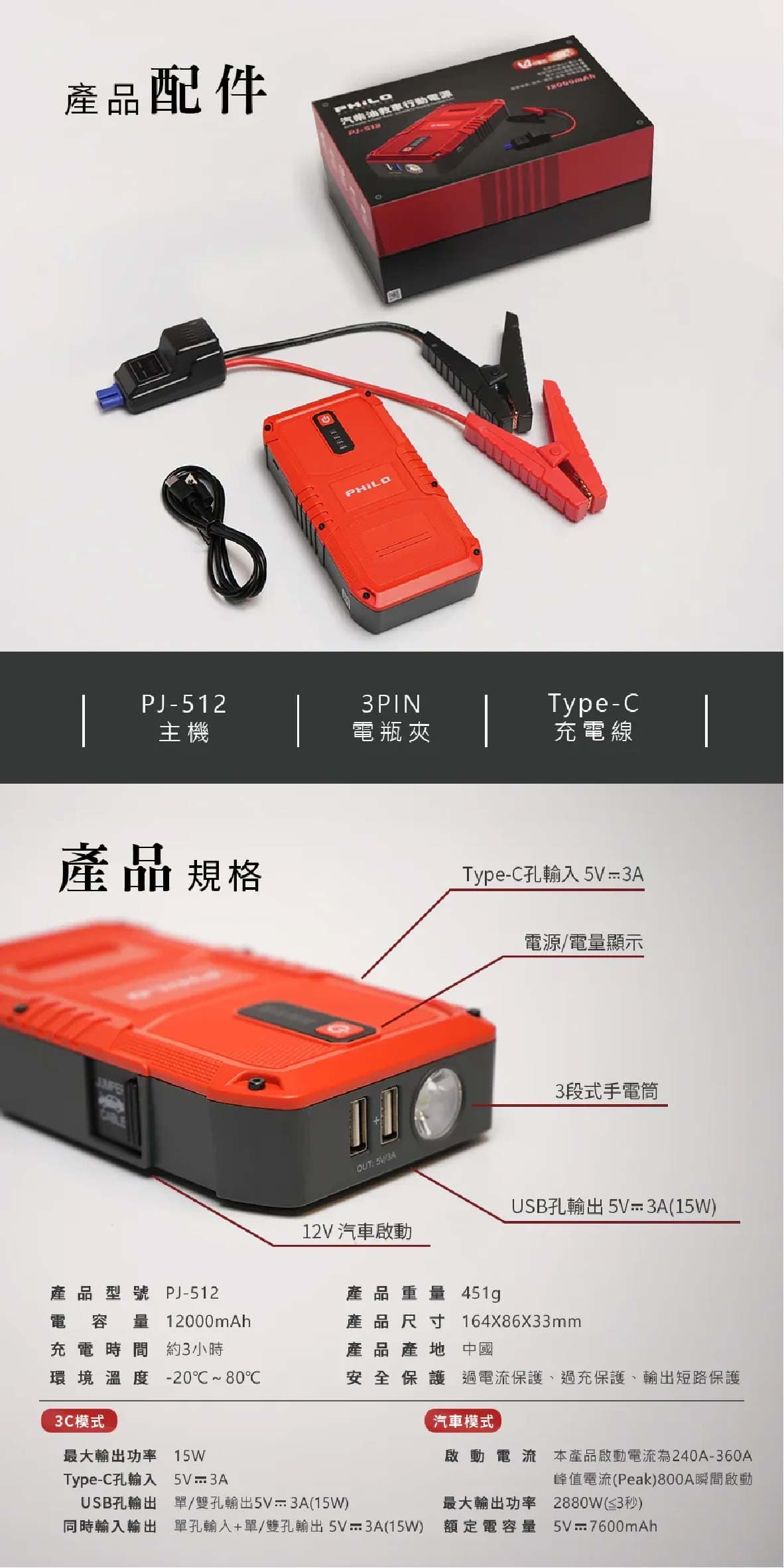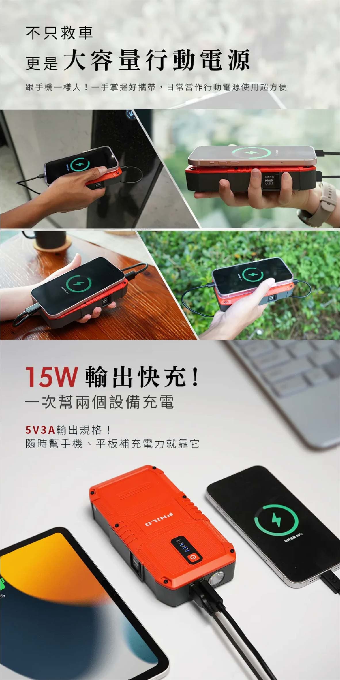 ‧汽車緊急啟動X行動電源X手電筒一機三用 ‧12000mAh超大電容量超強啟動性能汽車救援3秒啟動 ‧支援汽油車50~4000cc救援柴油車50~3000cc救援機車、轎車、小貨車都能救援 ‧使用3PIN智慧型電瓶夾具有溫度保護、電壓平衡、傳導強化三重保護 ‧重量輕巧大小跟手機一樣大日常當作大容量行動電源使用超方便 ‧三種高流明度LED照明模式照明/爆閃/SOS閃夜間救車一樣清楚 ‧戶外野營、夜間釣魚、登山黑夜的最強裝備照明時長可達10小時以上 ‧15W輸出快充2個USB輸出孔一次可幫兩個設備充電 ‧15W Type-C輸入快充充40~50分鐘的電量即可用於救車 ‧BSMI:R51275