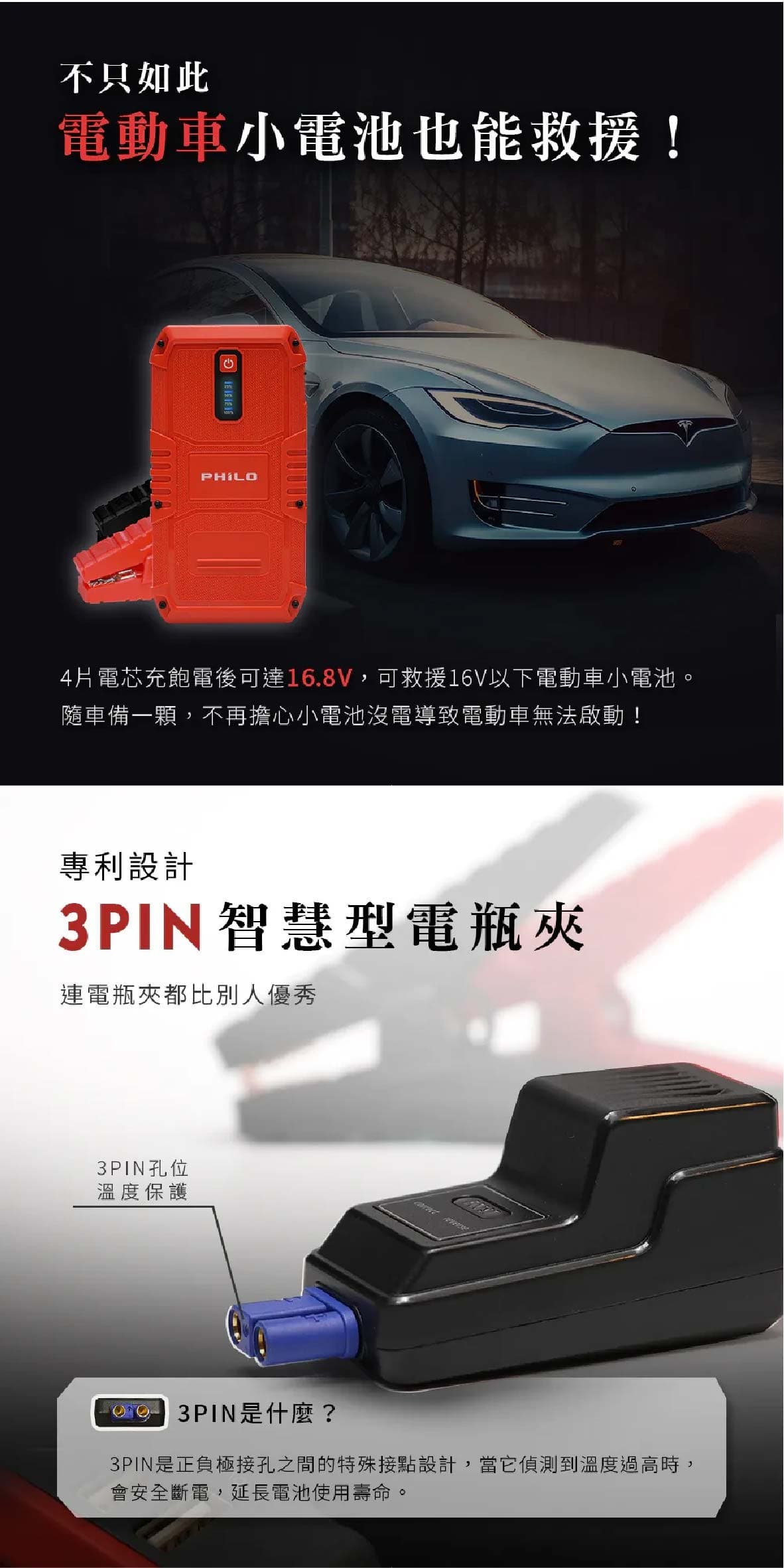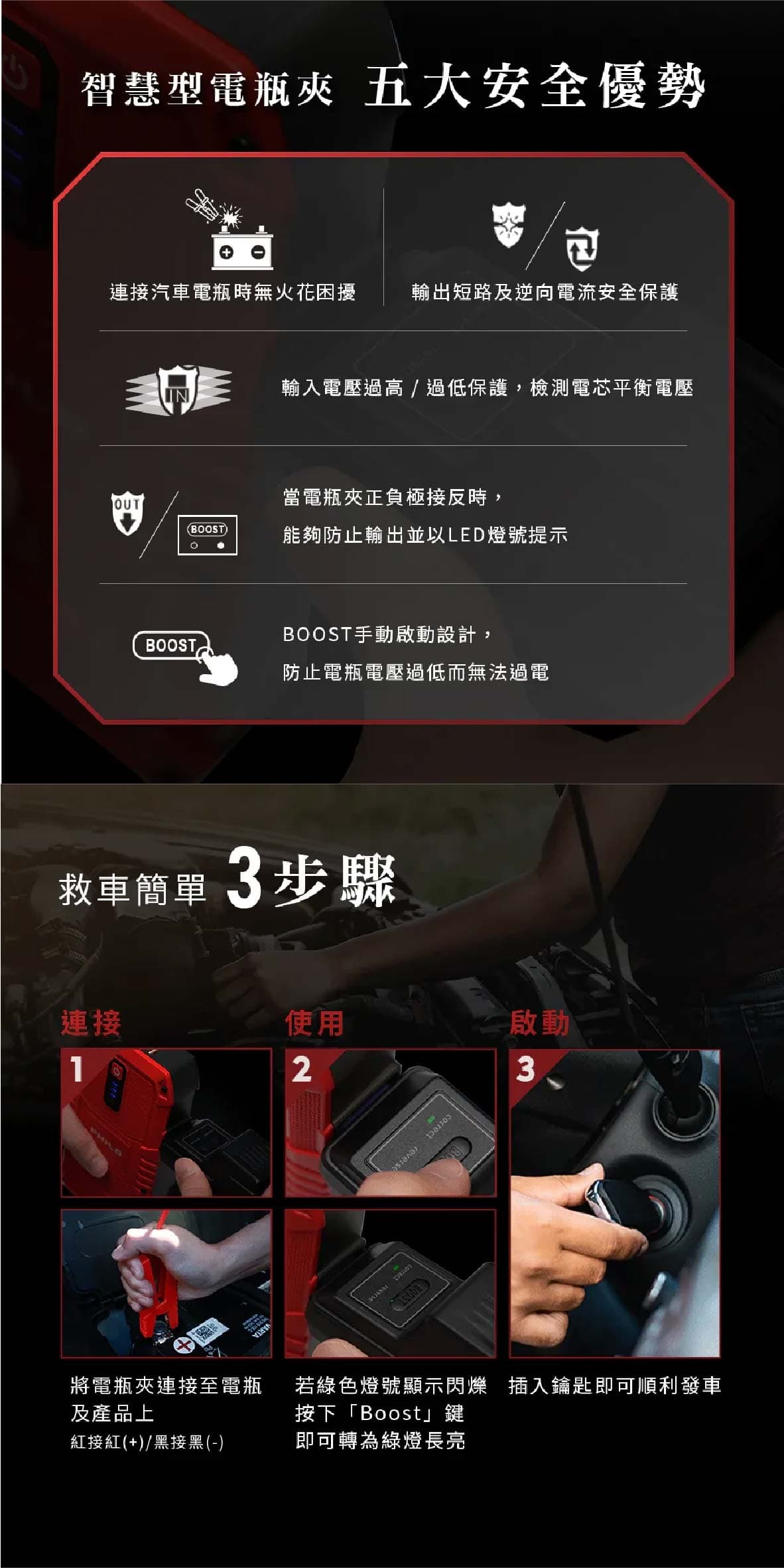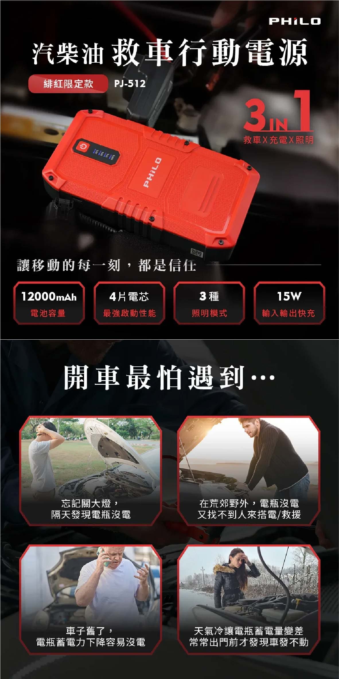 ‧汽車緊急啟動X行動電源X手電筒一機三用 ‧12000mAh超大電容量超強啟動性能汽車救援3秒啟動 ‧支援汽油車50~4000cc救援柴油車50~3000cc救援機車、轎車、小貨車都能救援 ‧使用3PIN智慧型電瓶夾具有溫度保護、電壓平衡、傳導強化三重保護 ‧重量輕巧大小跟手機一樣大日常當作大容量行動電源使用超方便 ‧三種高流明度LED照明模式照明/爆閃/SOS閃夜間救車一樣清楚 ‧戶外野營、夜間釣魚、登山黑夜的最強裝備照明時長可達10小時以上 ‧15W輸出快充2個USB輸出孔一次可幫兩個設備充電 ‧15W Type-C輸入快充充40~50分鐘的電量即可用於救車 ‧BSMI:R51275