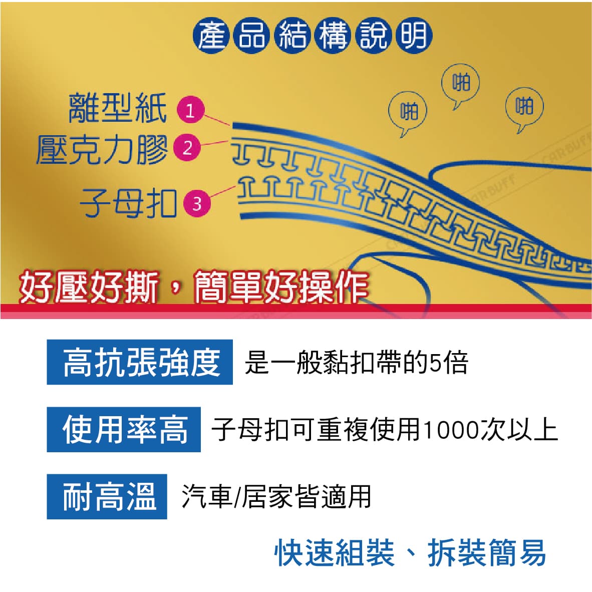 ◆ 免鑽孔、耐高溫、簡單好操作 ◆ 快速組裝、拆裝簡易 ◆ 抗張強度是一般黏扣帶的5倍 ◆ 子母扣可重複使用1000次以上 ◆ 壓克力膠超強黏性,耐高溫不易失去黏性 ◆ 可隨意剪裁使用 ◆ 汽車、居家可使用,用途廣泛