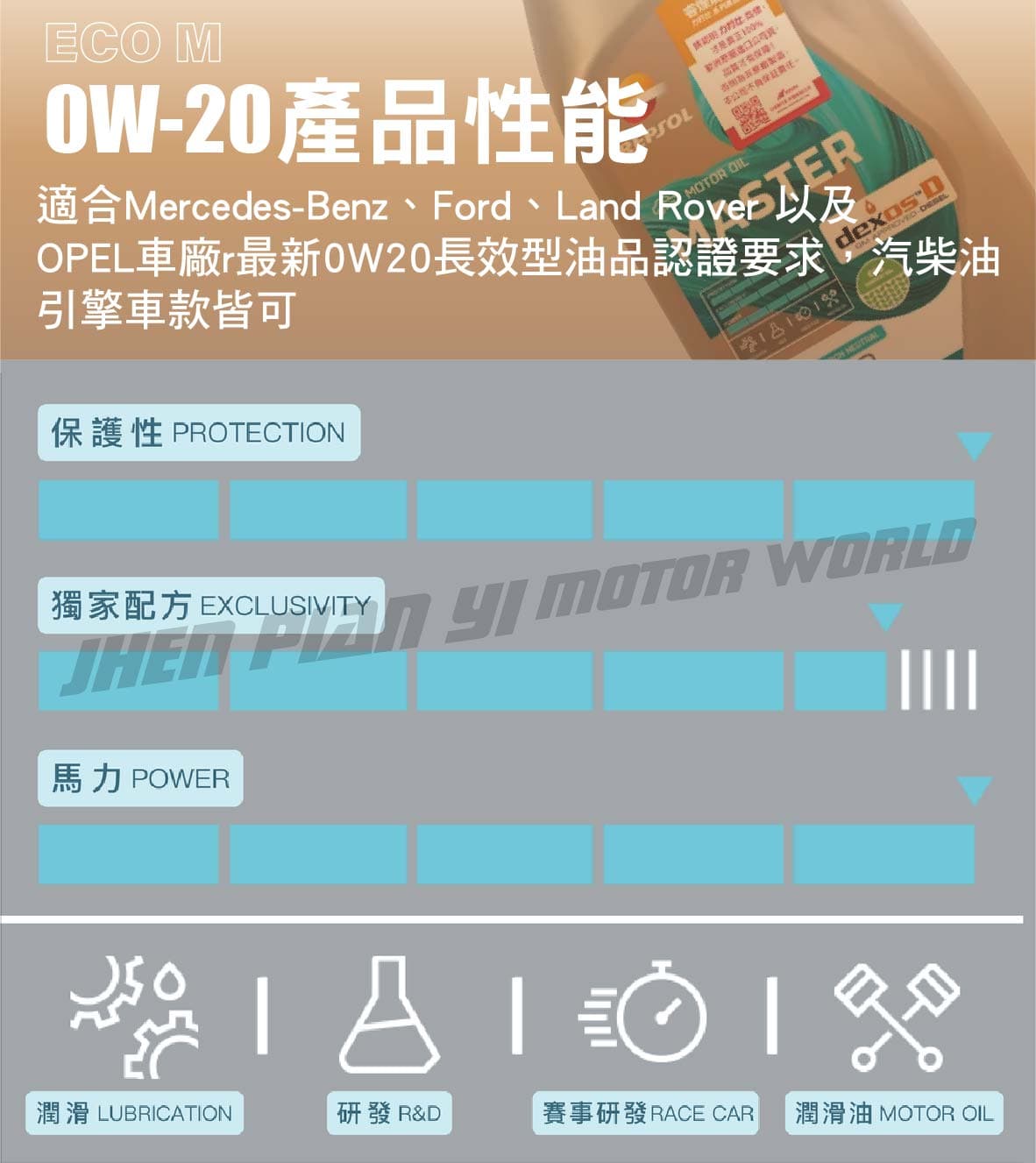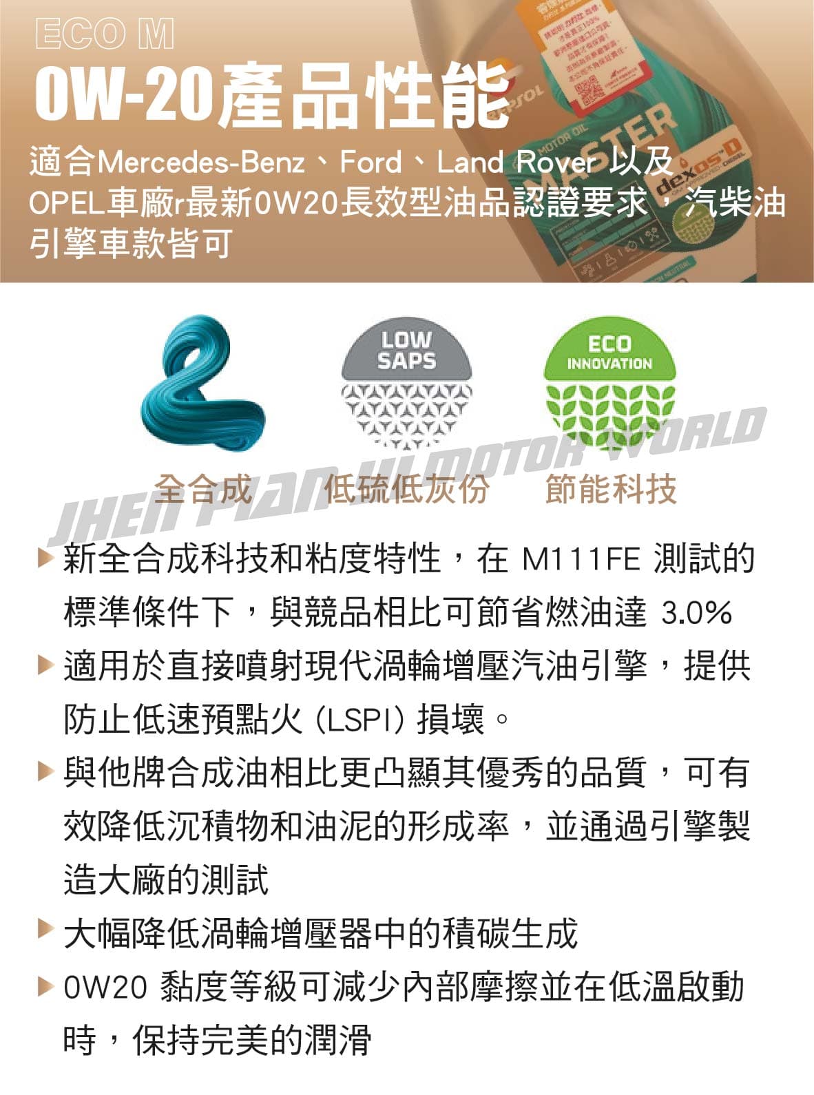 ‧符合ACEA C5 & C6 規範的全合成潤滑油,專為汽柴油引擎設計 ‧特別推薦於裝設微粒過濾器進行廢氣處理的汽油與柴油車輛 ‧在一般操駕條件下能大幅節省燃油和降低二氧化碳排放 ‧含有超長效特性,可延長潤滑油更換時間 ‧新全合成科技和粘度特性,在 M111FE 測試的標準條件下,與競品相比可節省燃油達 3.0% ‧適用於直接噴射現代渦輪增壓汽油引擎,提供防止低速預點火 (LSPI) 損壞 ‧與他牌合成油相比更凸顯其優秀的品質,可有效降低沉積物和油泥的形成率,並通過引擎製造大廠的測試 ‧大幅降低渦輪增壓器中的積碳生成。 ‧0W20 黏度等級可減少內部摩擦並在低溫啟動時,保持完美的潤滑