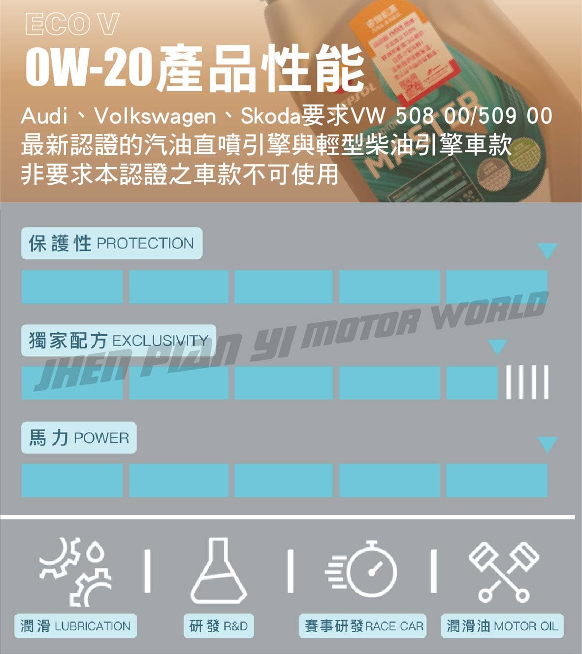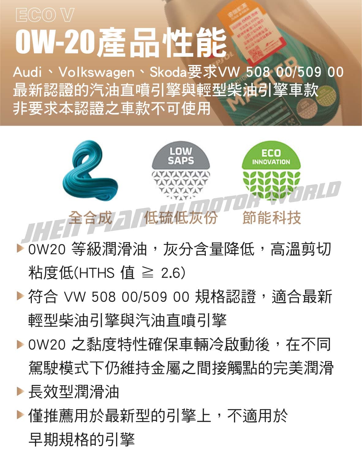 ‧EVOLUTION EVO V 0W20 高性能全合成潤滑油專為福斯集團旗下品牌(Audi、VW、Skoda、Seat),需要 VW 508 00/509 00 認證之最新引擎設計 ‧適用於汽油與柴油車輛。也可使用於需求 0W20、ACEA A C5 黏度等級產品的其他品牌車輛 ‧配方中基礎油與最先進技術添加劑的結合,確保節省燃油並保護 VW 508 00/509 00 規格引擎 ‧0W20 等級潤滑油,灰分含量降低,高溫剪切粘度低(HTHS 值 ≥ 2.6) ‧符合 VW 508 00/509 00 規格認證,適合最新輕型柴油引擎與汽油直噴引擎 ‧0W20 之黏度特性確保車輛冷啟動後,在不同駕駛模式下仍維持金屬之間接觸點的完美潤滑 ‧長效型潤滑油 ‧僅推薦用於最新型的引擎上,不適用於早期規格的引擎