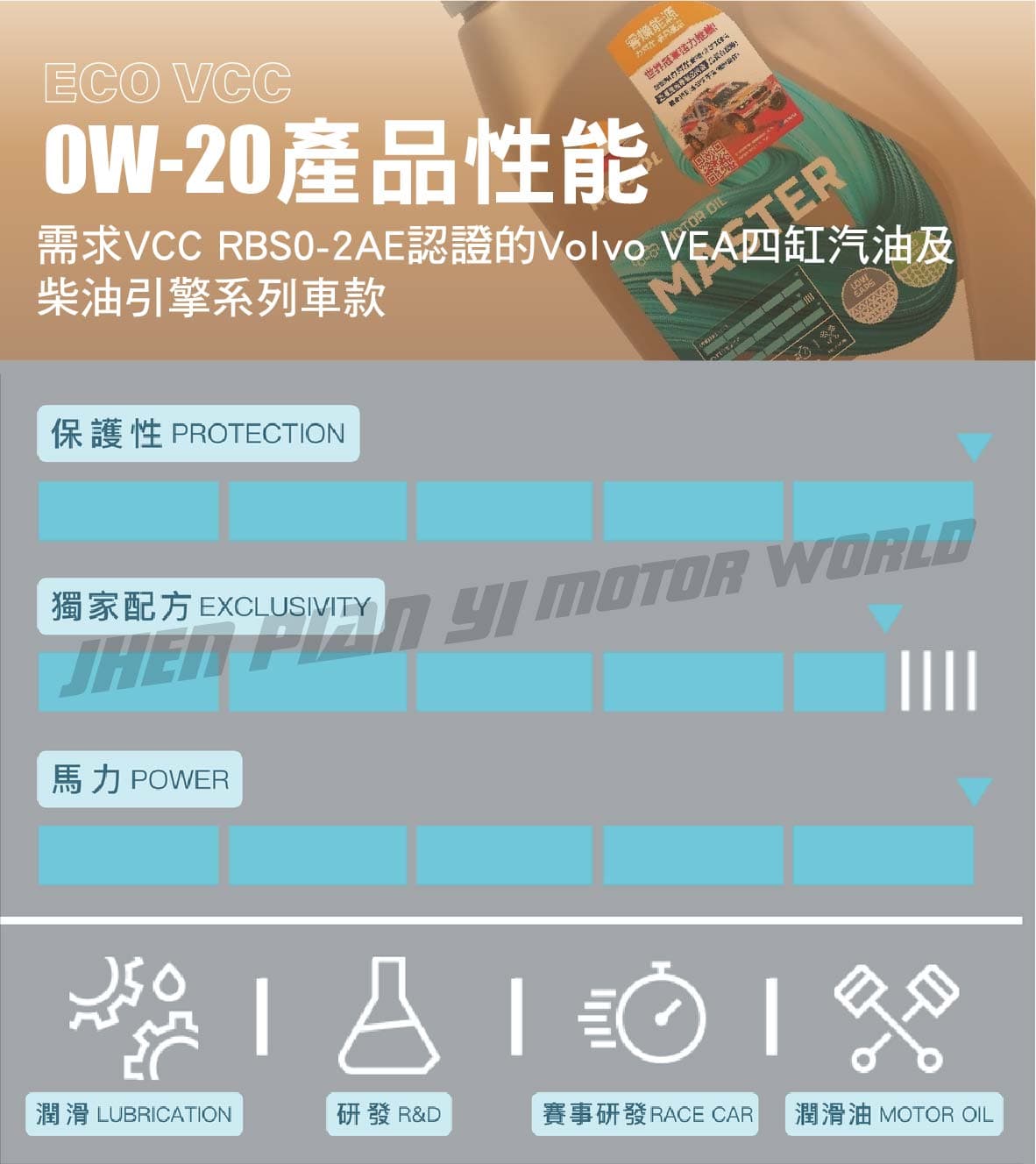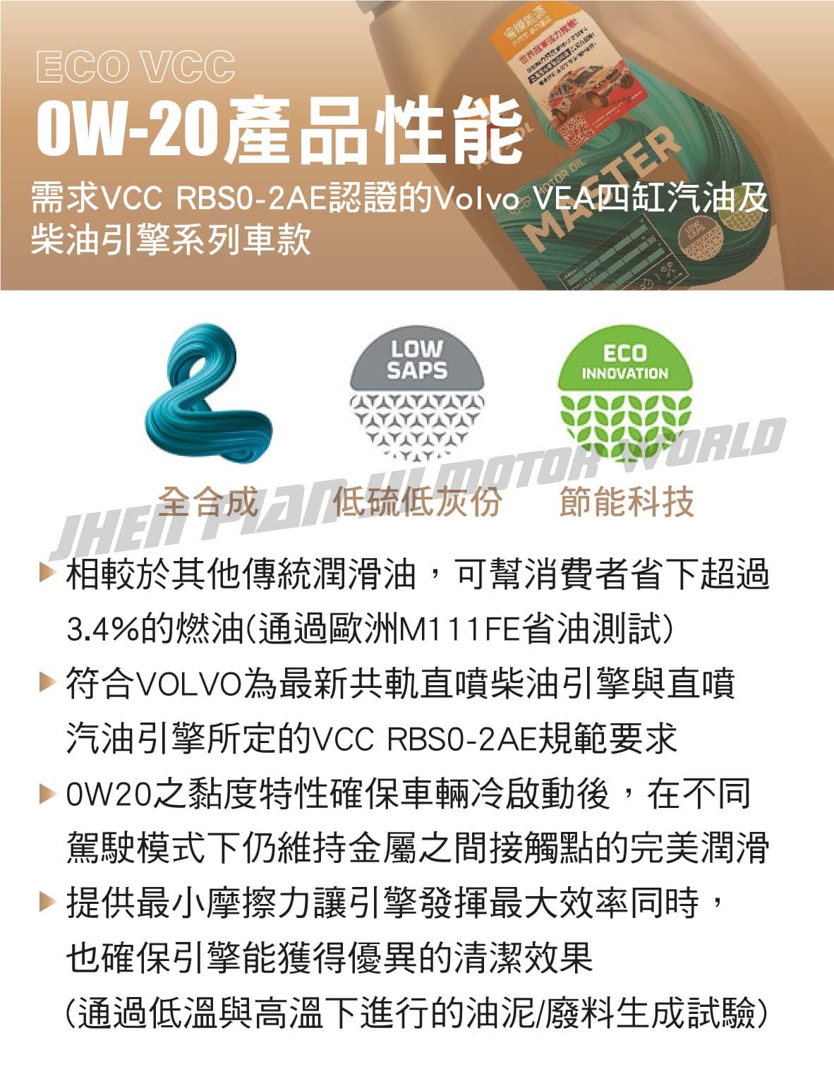 ‧一款專為VOLVO車款所研發的高性能全合成潤滑油 ‧是0W20系列油品中唯一適用於VOLVO VEA四缸柴油及汽油引擎的潤滑油 ‧在標準試驗中確保引擎高性能運轉同時仍能節省超過3.4%的燃油 ‧適用任何需求ACEA A1/B1或C5的車款 ‧相較於其他傳統潤滑油,可幫消費者省下超過3.4%的燃油(通過歐洲M111FE省油測試) ‧符合VOLVO為最新共軌直噴柴油引擎與直噴汽油引擎所定的VCC RBS0-2AE規範要求 ‧0W20之黏度特性確保車輛冷啟動後,在不同駕駛模式下仍維持金屬之間接觸點的完美潤滑 ‧提供最小摩擦力讓引擎發揮最大效率同時,也確保引擎能獲得優異的清潔效果(通過低溫與高溫下進行的油泥/廢料生成試驗)