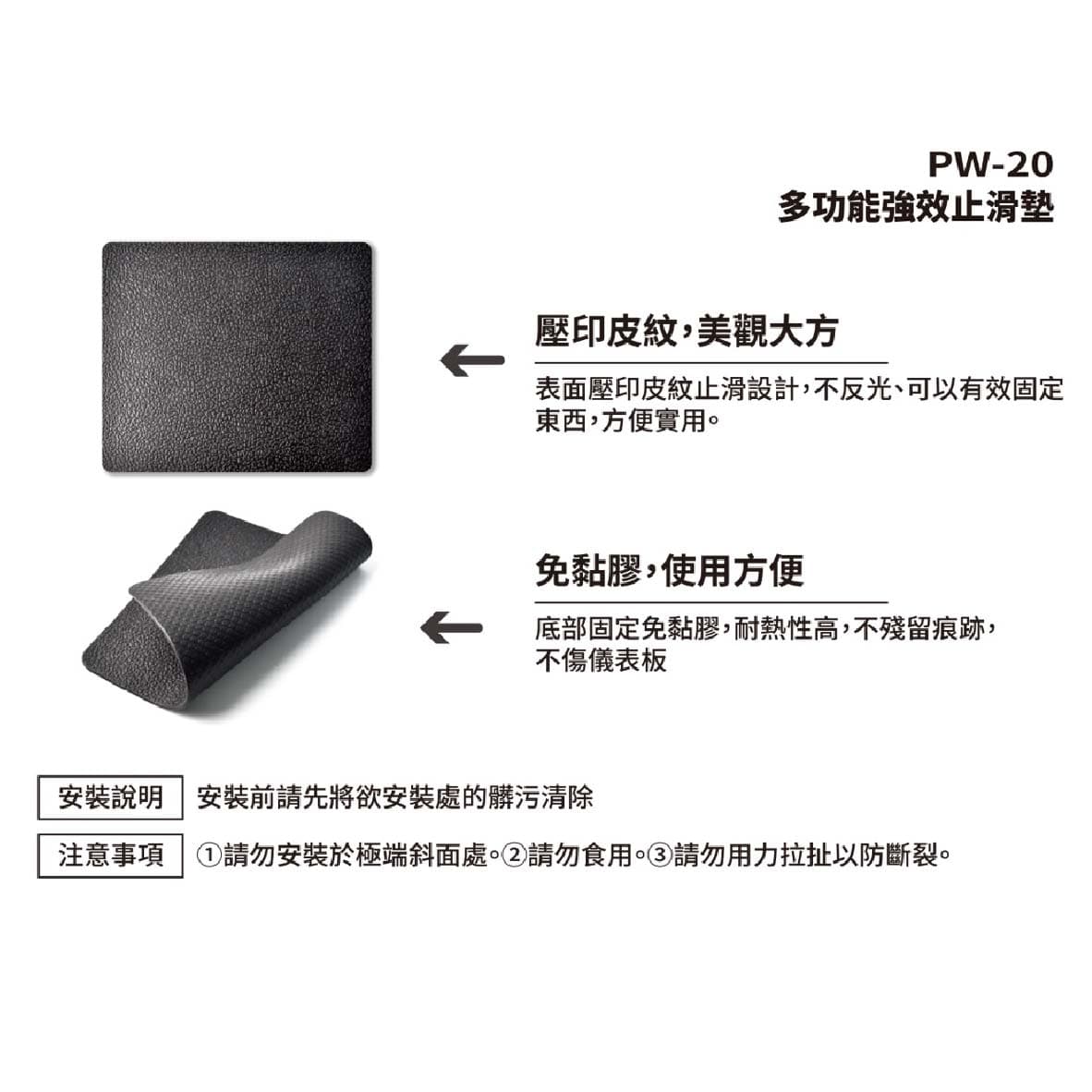 (1)皮革紋路設計,質感佳 (2)無黏性、不反光、不傷儀表板 (3)特殊止滑紋路設計可有效止滑 (4)不使用任何黏著劑,耐熱性高 (5)不會因高溫而融化與殘留痕跡 (6)可用清水洗淨後重複使用 (7)安裝簡單,可放置在曲面上,具超強的附著力 (8)避免零錢、眼鏡、手機等物品滑動..