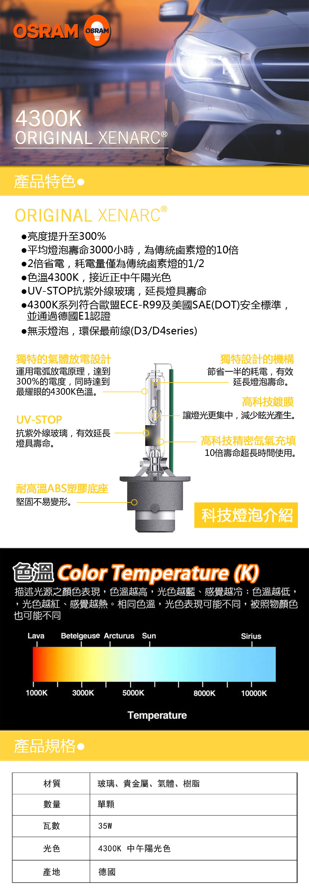 (1)亮度提升至300% (2)平均燈泡壽命3000小時,為傳統鹵素燈的10倍 (3)2倍省電,耗電量僅為傳統鹵素燈的1/2 (4)色溫4300K,接近正中午陽光色 (5)UV-STOP抗紫外線玻璃,延長燈具壽命 (6)4300K系列符合歐盟ECE-R99及美國SAE(DOT)安全標準,並通過德國E1認證 (7)無汞燈泡,環保最前線(D3/D4series)
